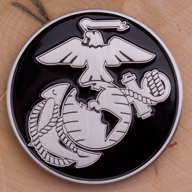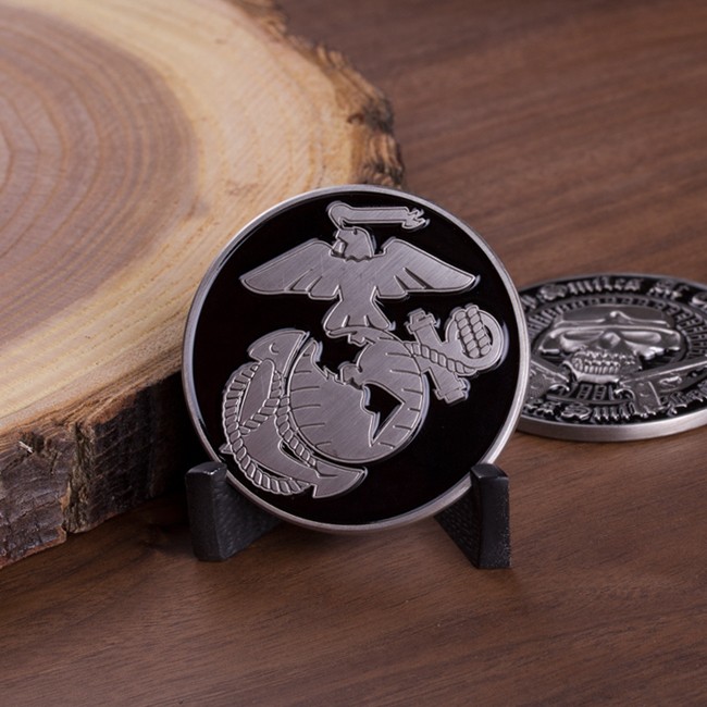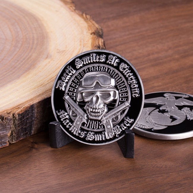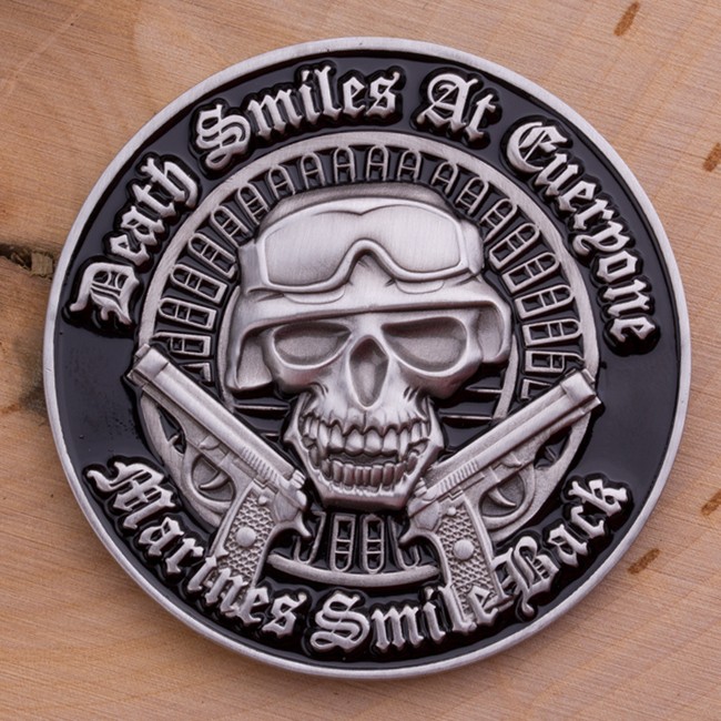 “Death Smiles at Everyone . . . Marines Smile Back” is asserted on this menacing 1.75″ antique silver challenge coin. The front of the coin features a 3D skull in combat gear and is flanked by handguns with surrounding bullets on a silver and black background. The reverse side of the coin is silver and black and features the Eagle, Globe, and Anchor. Smile in the face of death with this detailed challenge coin!