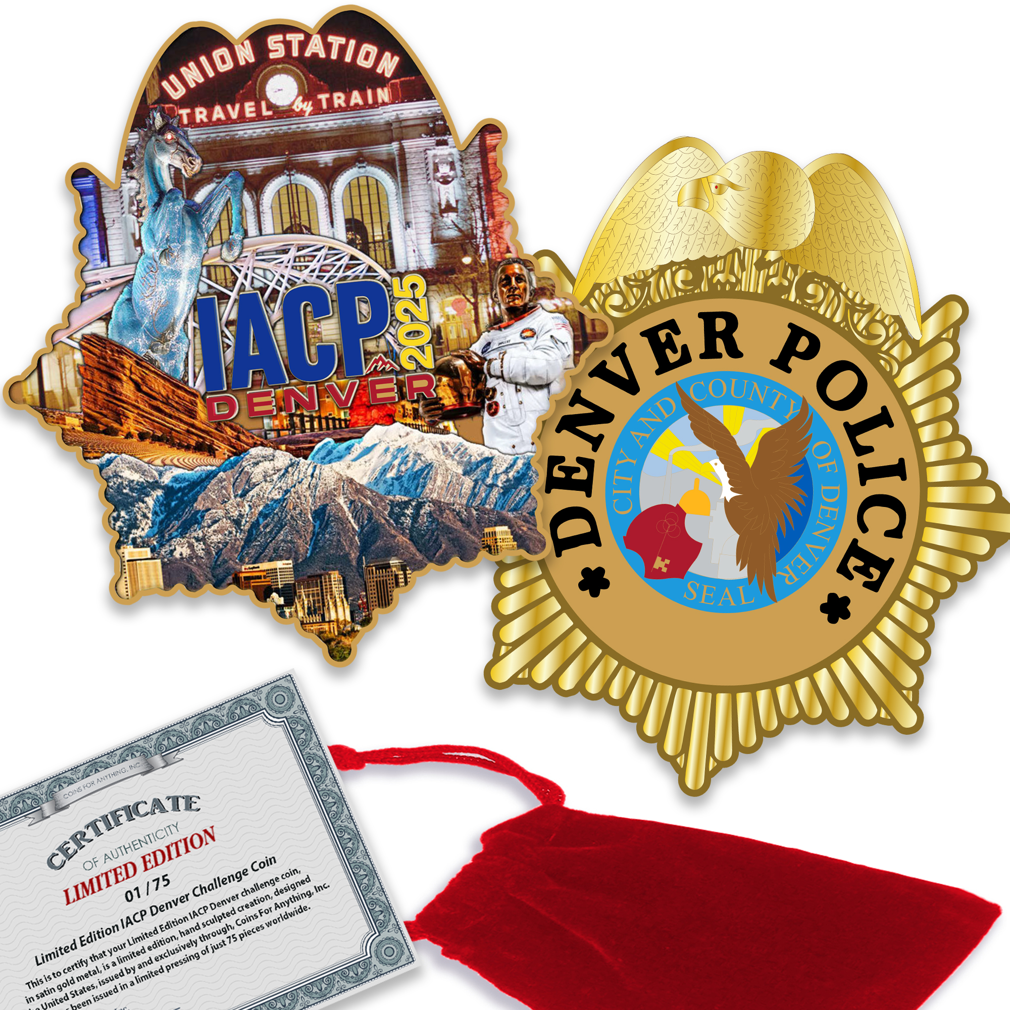 Only 75 of this limited edition version of our Denver Police IACP Challenge Coin were minted. Each coin is laser engraved along the side and comes in a blue velvet bag with a certificate of authenticity from us at Coins For Anything.