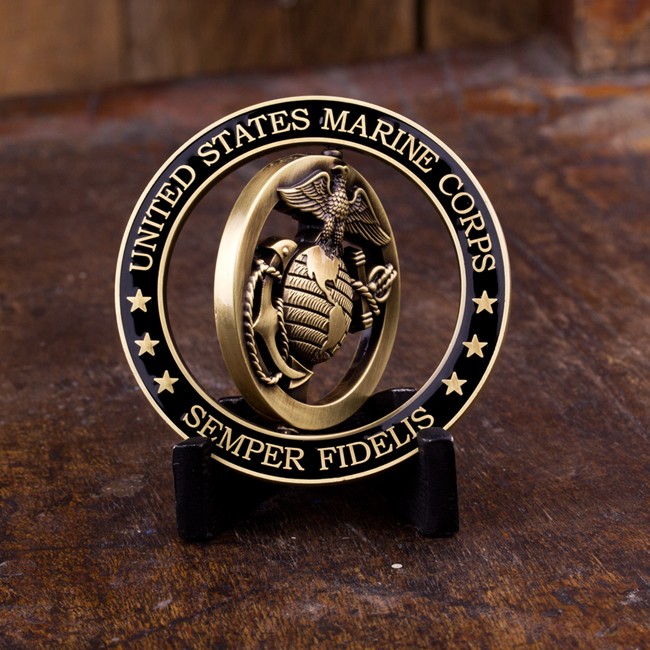 This 2″ antique brass challenge coin has a black border featuring “United States Marine Corps” and “Semper Fidelis” in antique brass text, while the center of the coin is a 3D Eagle, Globe, and Anchor that actually spins! A truly unique challenge coin for ANY collector or supporter of the U.S. Marines.