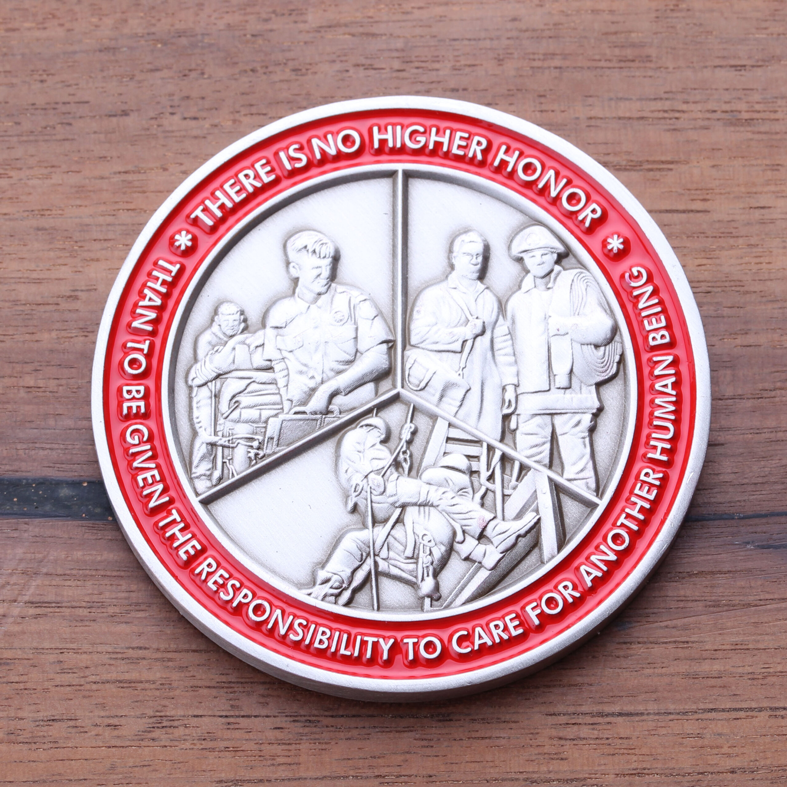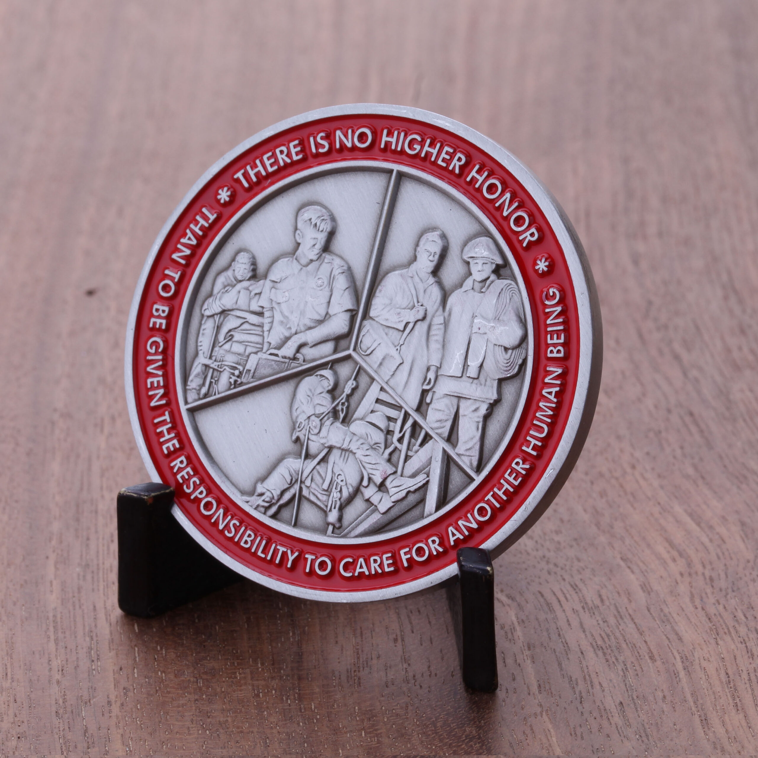 This EMS challenge coin makes the perfect gift for any EMT or Firefighter. Featuring the phrase “When Seconds Count” on one side and on the reverse stunning 3D imagery and the text “There is no higher honor than to be given the responsibility to care for another human being”. This coin is 1.75″ in diameter and has an antique silver finish.