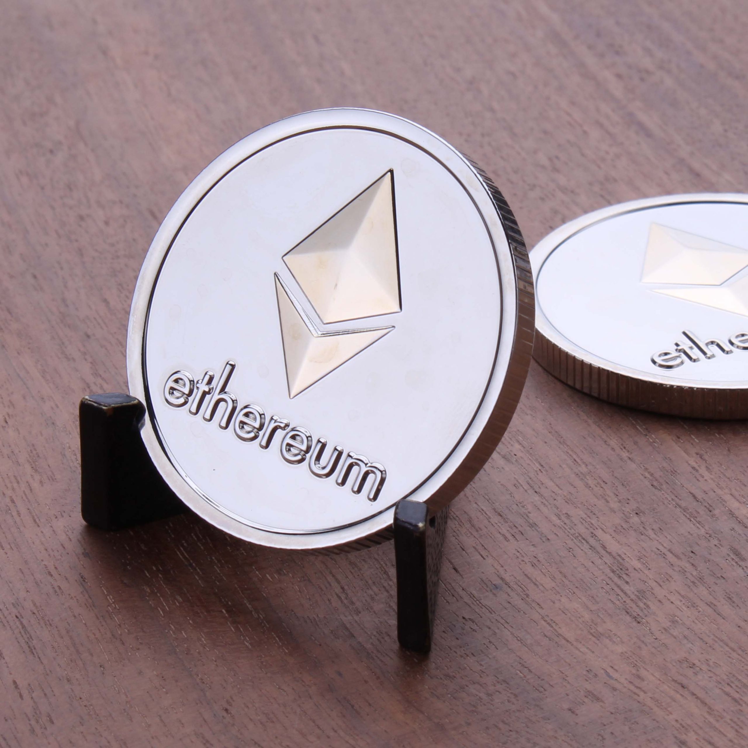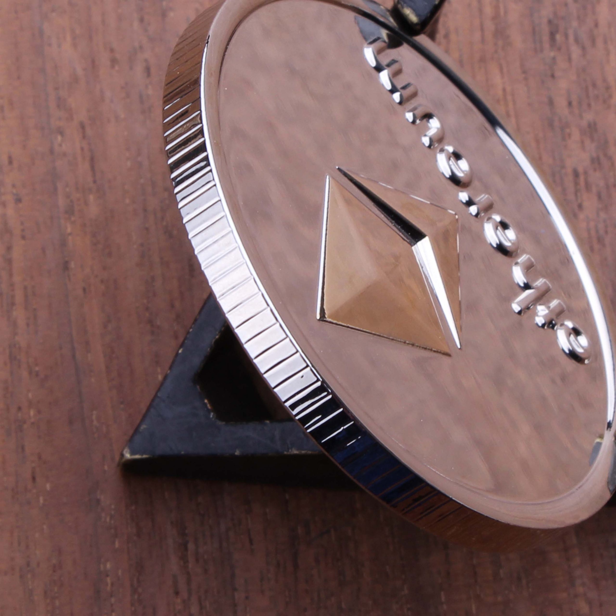 Impress your friends with this shiny silver 1.75″ Ethereum-inspired challenge coin. The Ethereum octahedron is plated in shiny gold for extra flair, and the rolling edge is reeded for an authentic currency feel.