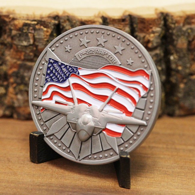 The F-22 Raptor is the latest 5th generation stealth tactical fighter. This sharp-looking commemorative coin is part of Coins For Anything’s American aircraft challenge coins series. Collect the coin you like most or get all of them. The back of the coin features highlights of each aircraft.