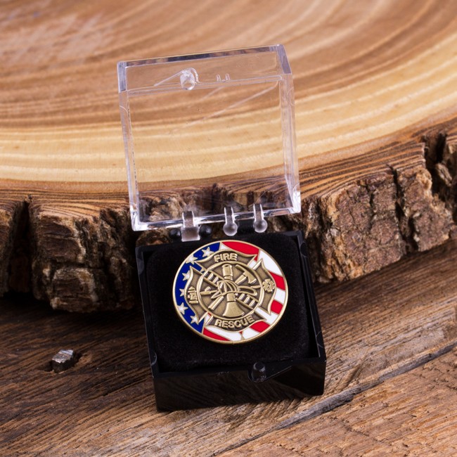 This 0.75″ diameter antique brass tie-tack features the Fire and Rescue Emblem in raised metal, with a colorful American flag background, and comes in its own plastic case. A great way to wear your pride for firefighters!