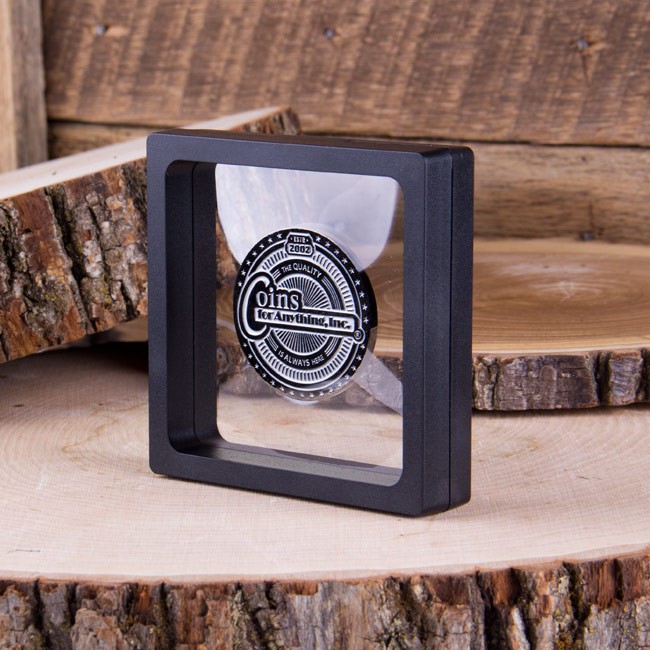 Showcase your collectible coin with this breathtaking display! Coins seamlessly float between two sheets of flexible plastic that grip the coin into place. Outlined in a black textured frame, this coin display will make a striking statement piece on any desk! The overall size of this floating case is 4.25″ x 4.25″ x .75” and the window measures 3.75″ x 3.75″.