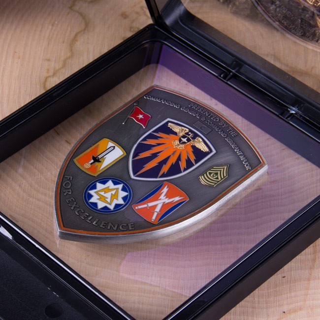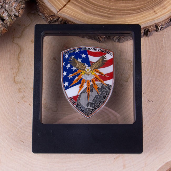 Coins seamlessly float between two sheets of flexible plastic that grip the coin into place. Outlined in a black textured frame, this coin display will make a striking statement piece on any desk! The overall size of this floating case is 3.5″ x 4.375″ x .75″ and the window measures 3″ x 3″. Choose customize the display by adding a laser engraved nameplate along the base.