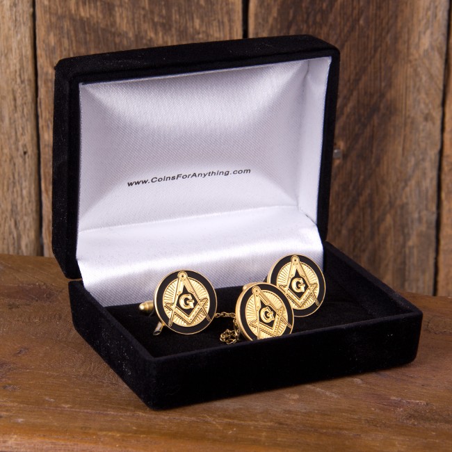 The Square and Compasses is the focus of the design for this satin gold Freemason Cufflinks and Tie-Tack Set. The satin gold plating stands out against a contrasting uncoated black paint, and the starburst gives the set a striking look. Each piece is 0.75” diameter, and the entire set arrives in a beautiful black velvet box that is perfect for storage or presentation.