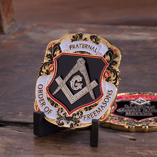 This uniquely shaped 1.75” challenge coin is gold with black, white, and red detailing. The front side displays the detailed Masonic Square and Compasses in shiny nickel, on a midnight black shield with scarlet edging. White banners display the words “FRATERNAL ORDER OF THE FREEMASONS.” On the reverse side, a black shield encases the words “MAKING GOOD MEN BETTER” which is placed beneath an additional Square and Compasses and a red ribbon displaying the word “MASONS.” All are set against the background design of curling black and red feathers, which contrasts beautifully with the golden coin. A great gift for yourself or a loved one that supports Freemasonry!