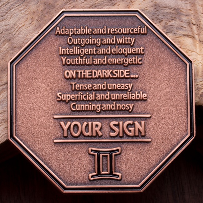 Do you ever question if you will be compatible with a new partner, or why you don’t get along with certain people? The answer may have to do with your astrological sign. Introducing a unique series of collectible coins that feature amazing facets of the Zodiac. These 2″ antique copper Gemini coins are octagon in shape and raised areas of metal allow for key design elements to be paint filled with black. The front sides feature the zodiac iconography along with compatible signs. The backsides of these Gemini zodiac themed gifts display the sign’s strengths and weaknesses, as well as the sign’s own symbol. Order your own sign, and your significant other’s sign.