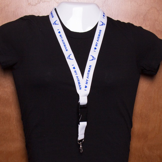 This white and blue imprinted polyester lanyard is 1″ in width and approximately 20″ long. It features repeating blue Air Force logos as well as the phrase, “I (heart) My Airman.” Each lanyard comes complete with a sturdy safety buckle, buckle release and metal lobster claw to safely secure your belongings.
