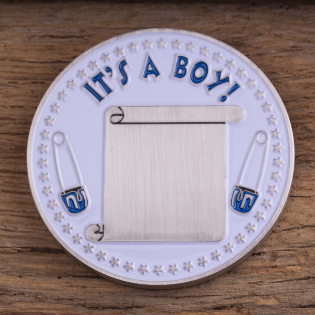 This 2″ antique silver coin features an adorable blue background with a centered white letter “B” surrounded by timeless children’s toys, all in full bright colors and covered with a protective clear epoxy coating. The reverse side reads “IT’S A BOY!” in bold blue font, with an engravable antique silver scroll flanked by two diaper pins on a white background. Personalize this coin by engraving the baby’s name, date of birth, and other relevant birth statistics. Makes a unique birth announcement!