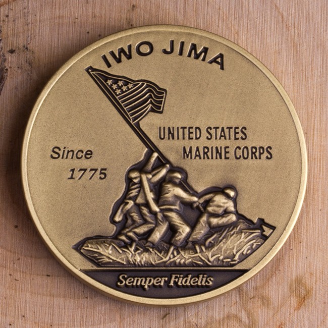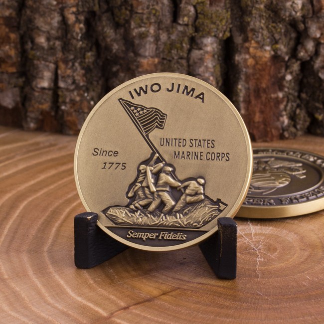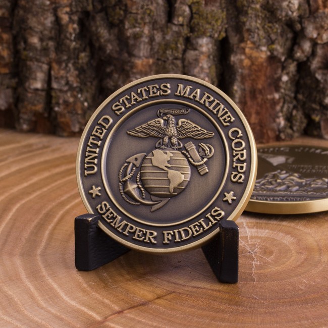This 1 5/8″ antique brass challenge coin features the well-known Iwo Jima Memorial, in detailed raised metal, surrounded by the text “Since 1775”, “United States Marine Corps”, and “Semper Fidelis.” The reverse side features a 3D Eagle, Globe, and Anchor, bordered by the words “UNITED STATES MARINE CORPS” and “SEMPER FIDELIS.” Remember the history of the Marine Corps with this collectible coin!