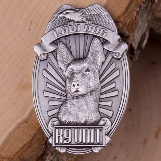 What better way to honor man’s best friend than with a challenge coin to commemorate your canine’s hard work and service to the force? This ellipse-shaped coin is topped off with an eagle holding a banner, which on the front reads “Law Dog” above an image of your furry companion and the words “K9 Unit”. On the back the Eagle presents the phrase “Always On Duty” which hangs over a canine mantra of love and loyalty. Below this is a paw print with the blue line of the police force across it. So celebrate your four-legged friend and get one today!