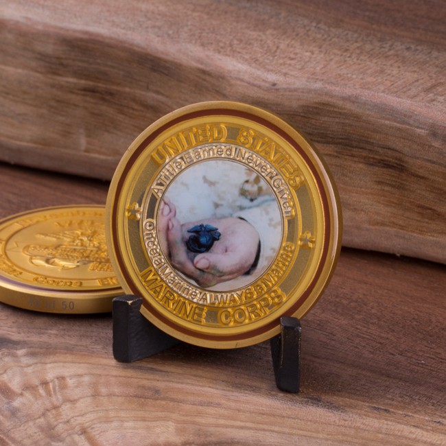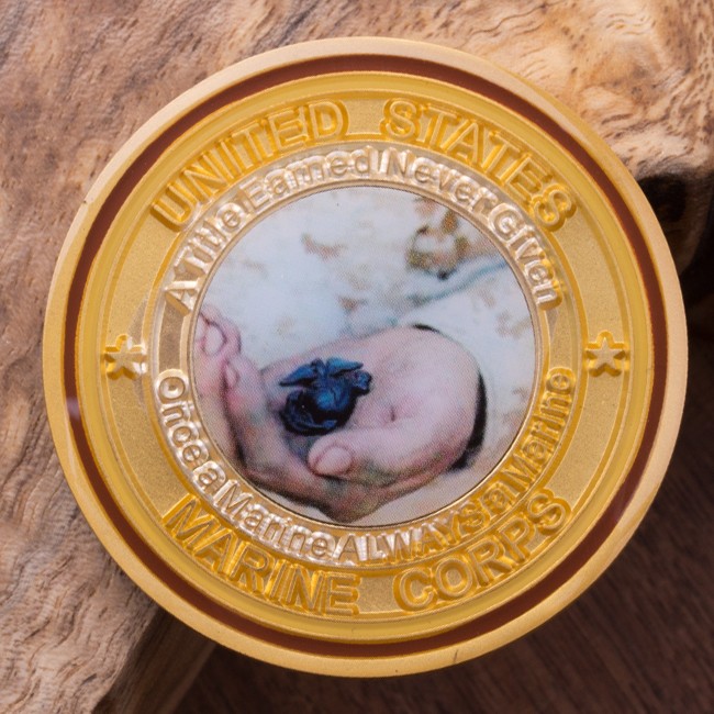 This Limited Edition 1.75″ Satin Gold challenge coin features a picture insert on the front side of a true US Marine holding an Eagle, Globe, and Anchor in the palm of his hand. The picture is encircled by the phrase: “A Title Earned Never Given … Once a Marine ALWAYS a Marine.” The reverse side of the coin features the date the Marine Corps was founded, November 10, 1775, and the Eagle, Globe, and Anchor displayed proudly with the words, “Celebrating 237 Years of Excellence.” Scarlet rings add a finishing touch, and the coin has a protective clear epoxy coating on both sides. This coin is numbered (1 of 50 – 50 of 50) and will arrive with a certificate of authenticity and black velvet bag. A must have for any collector!