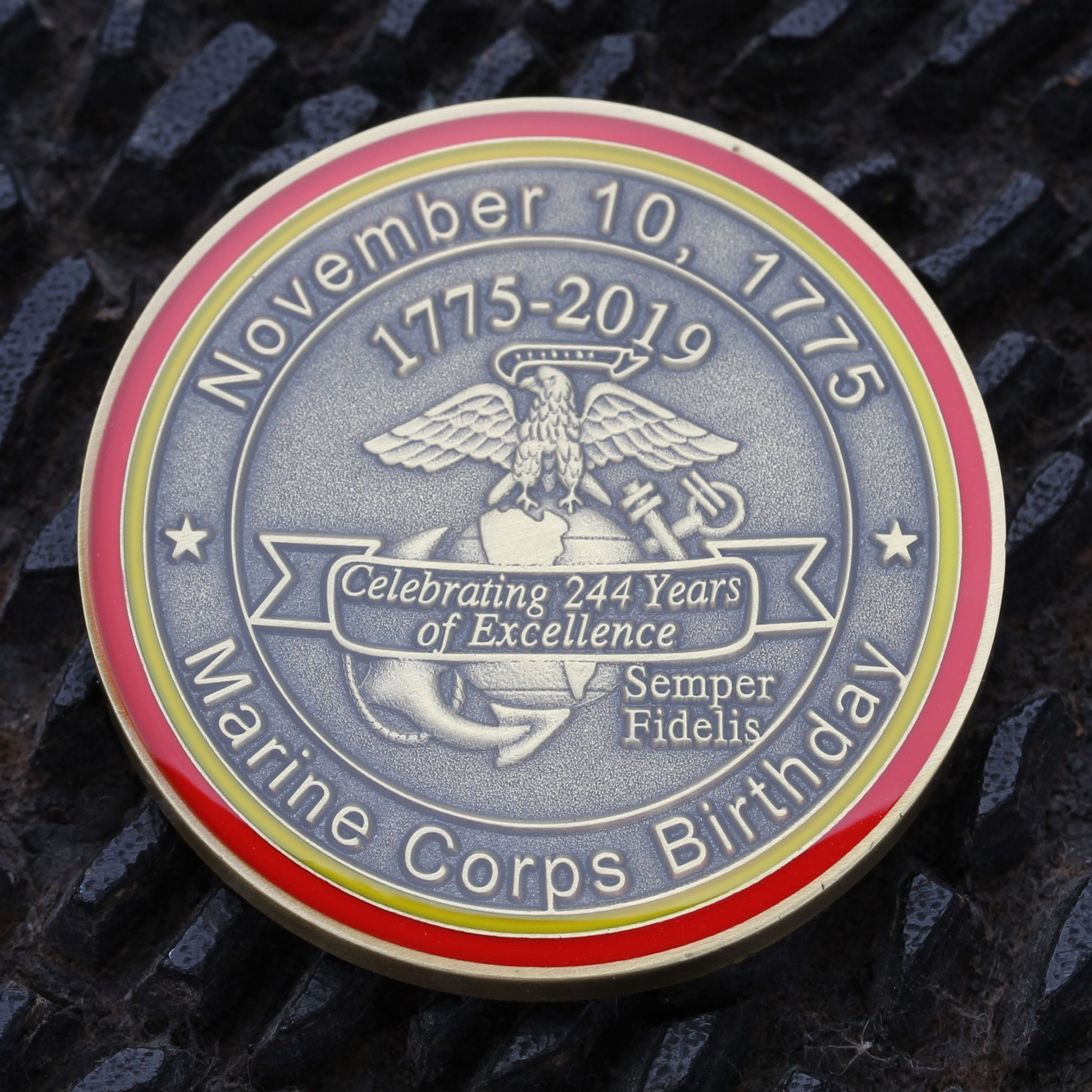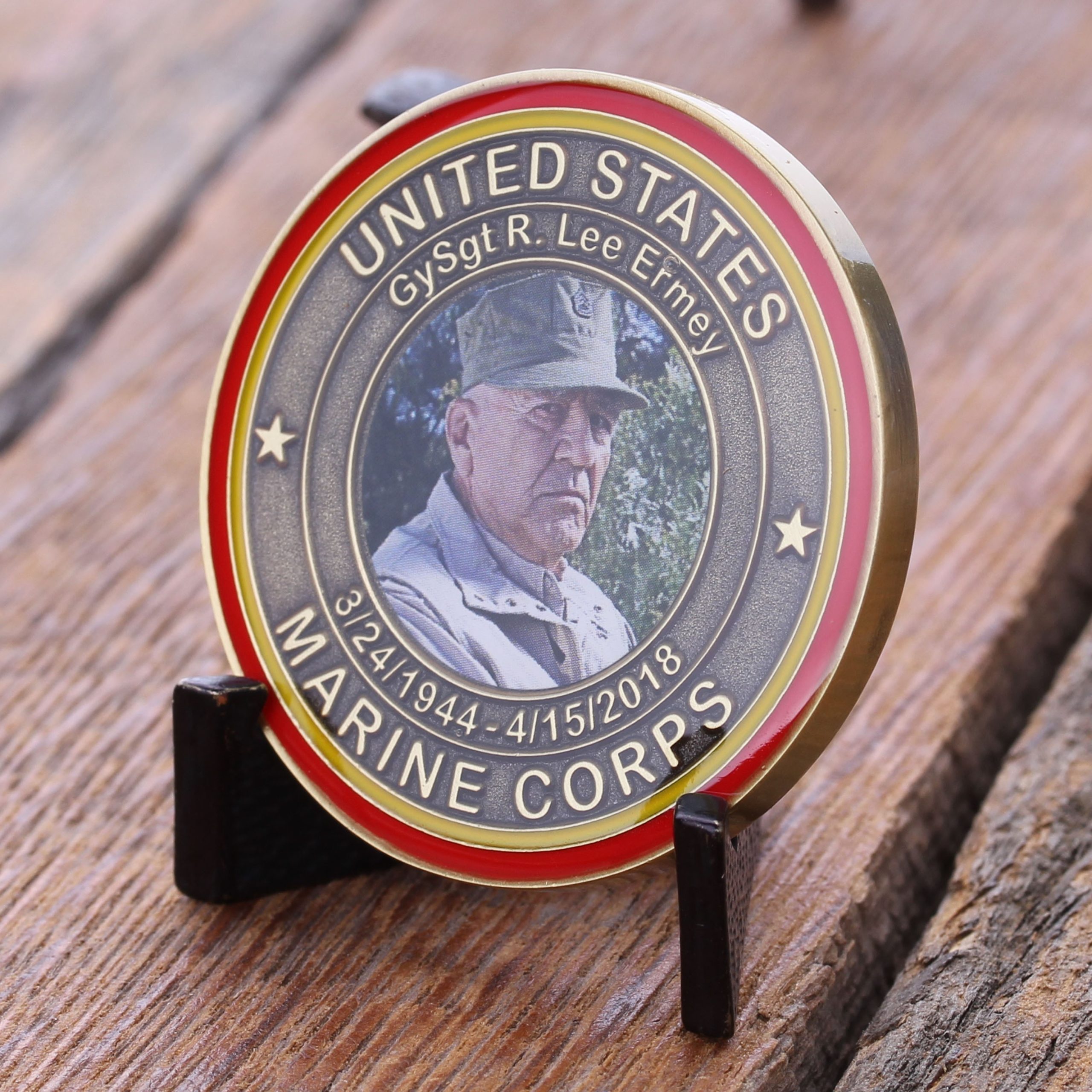 This coin is part of an annual series minted since 2002 by Marine Veteran-owned company Coins For Anything, Inc. Each year features a Marine Corps tradition, unit or aspect of the Marine corps which all Marines can relate to. This year’s coin honors Marine and movie star GySgt R. Lee Ermey. GySgt Ermey was a classic drill instructor in many famous American films and TV shows.