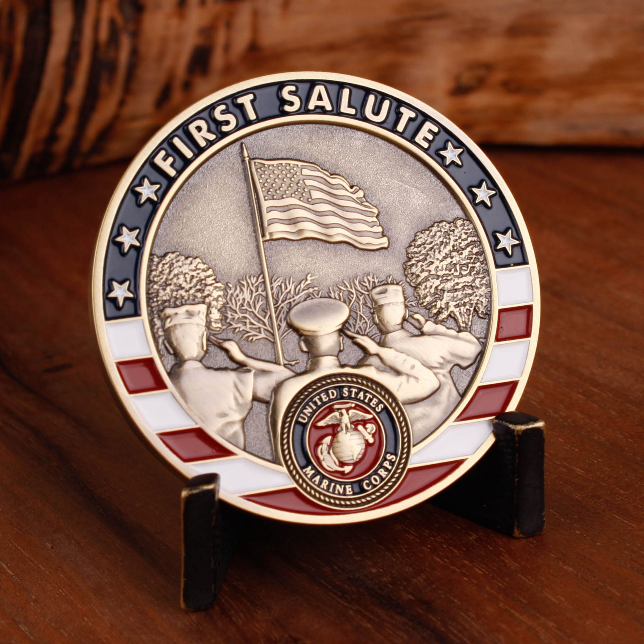 This first salute challenge coin is a perfect gift for any newly commissioned Marine Corps Officer or for that officer to hand to the Marine that gave him his first salute. This dignified 1.75” antique brass coin features the Officer Oath of Office on one side and military members saluting on the other side with the Marine Corps Seal.