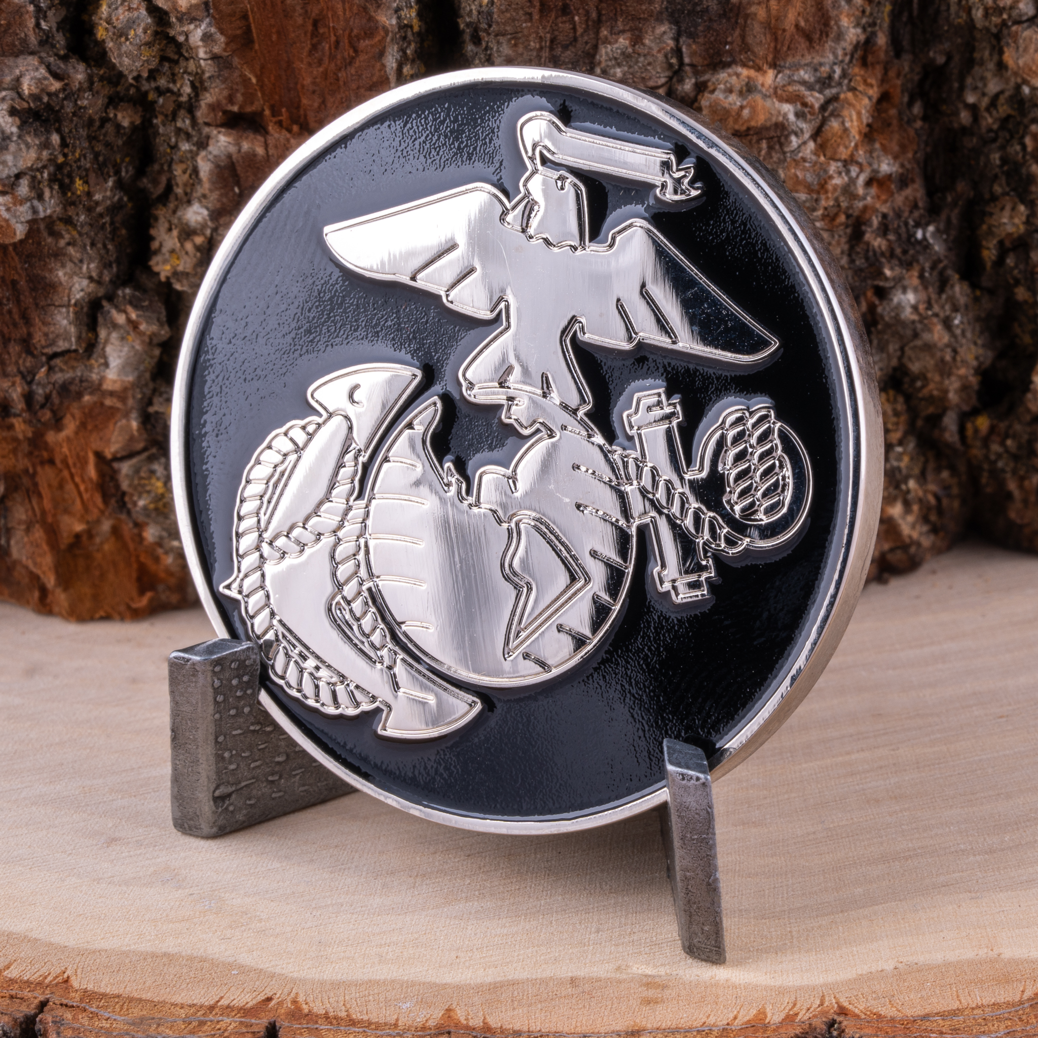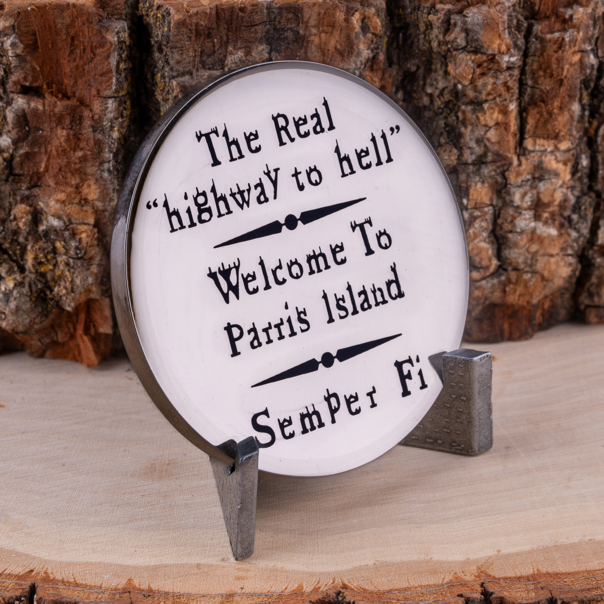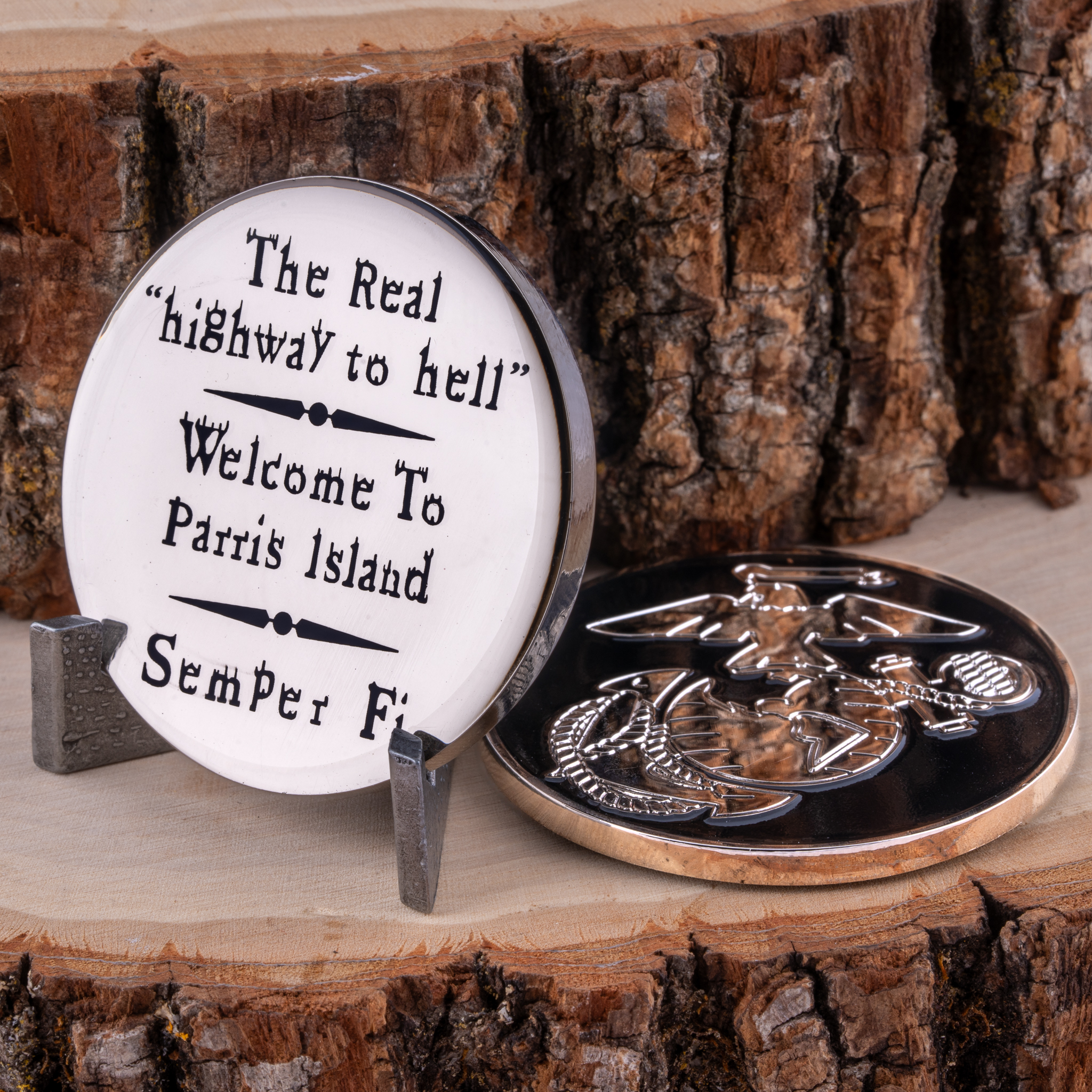 Marine Corps Recruit Depot Parris Island in Beaufort, South Carolina is tasked with the training of enlisted Marines and boot camp is no walk in the park. This 1.75″ challenge coin features a beautiful Eagle, Globe, and Anchor in shiny nickel on a black background. The reverse side includes the phrases “The Real Highway to Hell,” “Welcome to Parris Island,” and “Semper Fi” in black “fire” font.