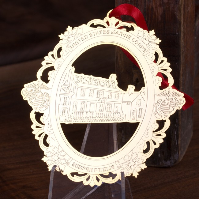 This festive shiny gold plated U.S. Marine Christmas ornament is 3″ x 2.75″ and is etched with a beautiful cut-out rendering of Tun Tavern, flanked by etched Eagle, Globe, and Anchors. The top arched text reads, “United States Marine Corps” and the bottom text reads, “Semper Fidelis.” Each Tun Tavern Marine Corps ornament comes with a red ribbon that is perfect for hanging and display. Makes a great stocking stuffer!