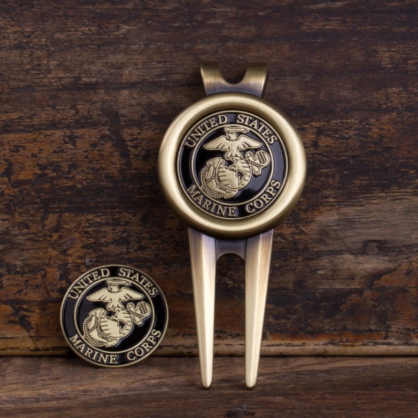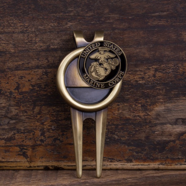 A divot tool is used to fix the indention made after a ball hits the green, and a ball marker is used to reserve a ball’s position. This set includes a 3” x 1.35” durable antique brass divot tool with an attached clip for easy carrying, and two coin golf ball markers featuring a brass Eagle, Globe, and Anchor, and the text, “United States Marine Corps.” The coin golf ball markers are magnetic and fit perfectly by attraction into the divot tool. This divot tool and ball marker set is a unique USMC Retirement Gift or gift for ANY golfer that supports the U.S. Marines!