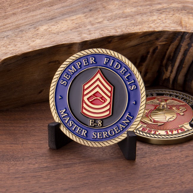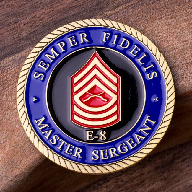 This challenge coin is 1.75″ antique brass with a real rope edge. The front of the coin has a blue ring with the words “Semper Fidelis” at the top and “Master Sergeant” at the bottom. The middle of the coin has a black background and features the rank insignia in full color. The back of the coin has a 3D Eagle, Globe, and Anchor in antique brass on a scarlet background and “United States Marine Corps” surrounding the center.