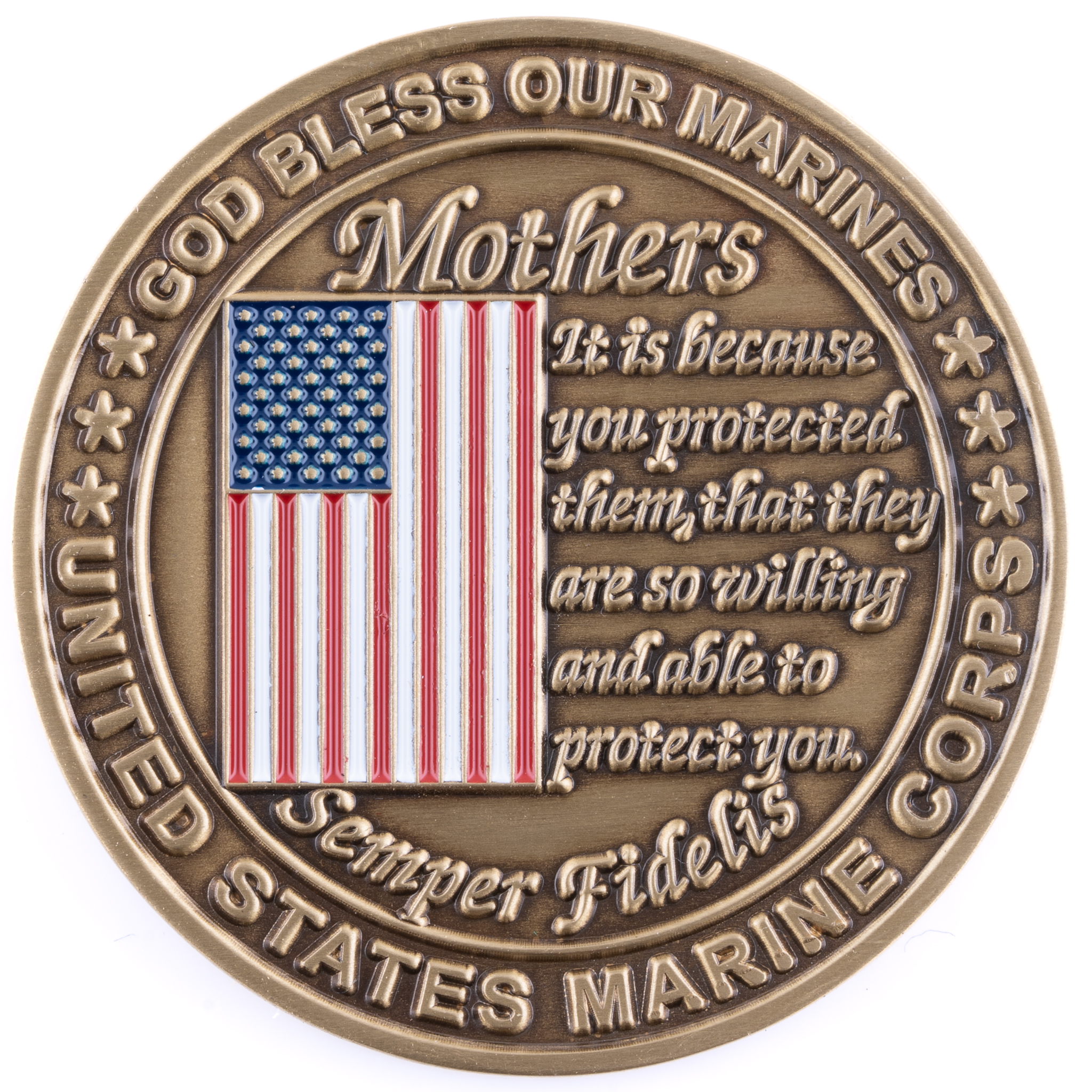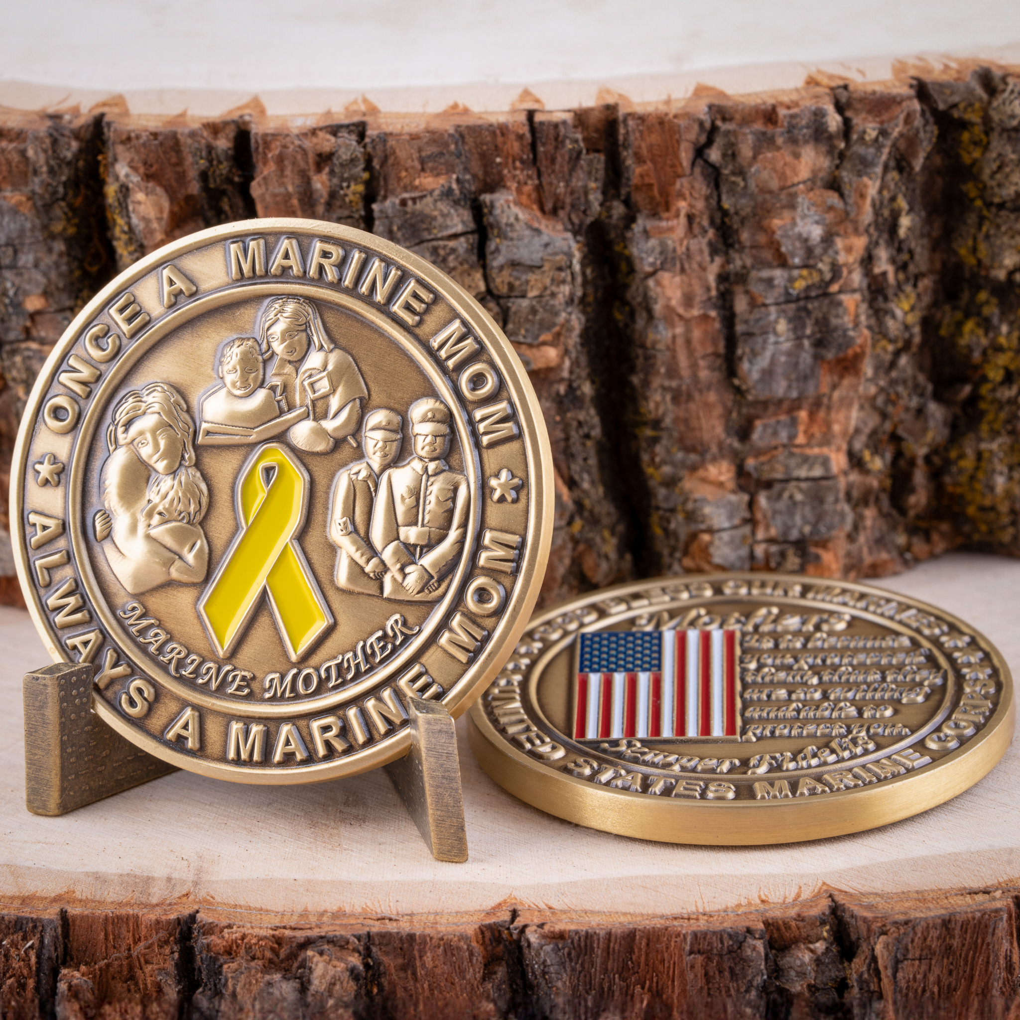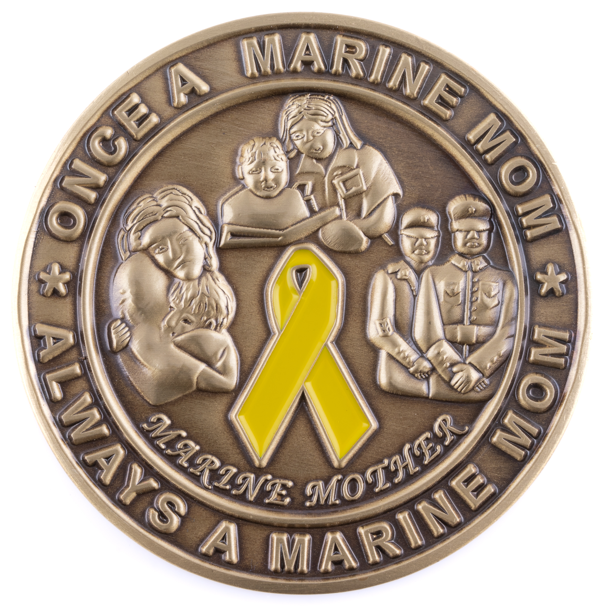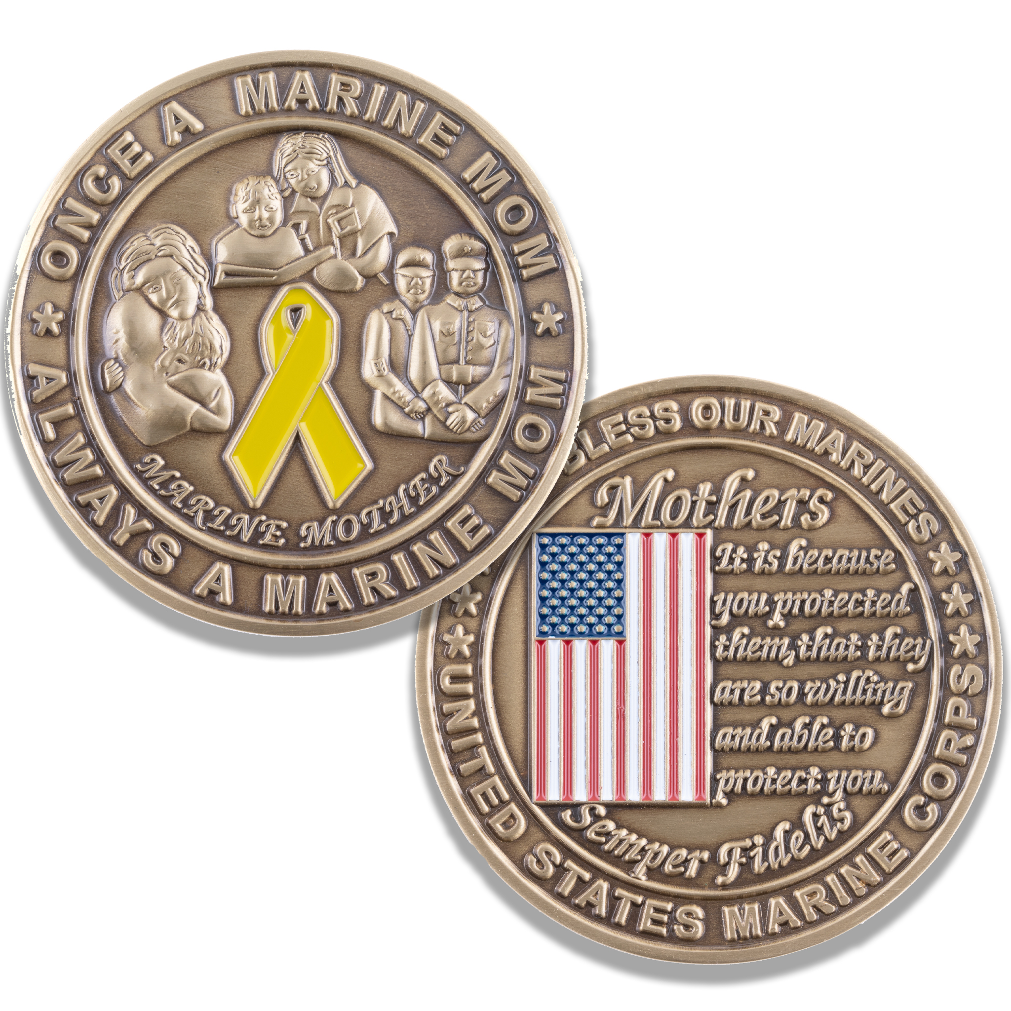 The very first coin made by Coins For Anything! This 1.75″ antique brass challenge coin has a special message about being a proud Marine Mother: “It is because you protected them that they are so willing and able to protect you” and is surrounded by the words “God Bless Our Marines” and “United States Marine Corps” in raised brass. The reverse side features the phrase “Once a Marine Mom, Always a Marine Mom” and features a yellow ribbon and 3D Marine Mom imagery.