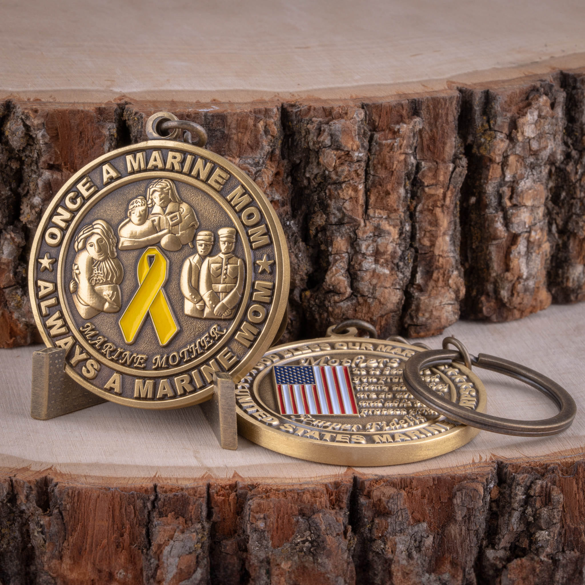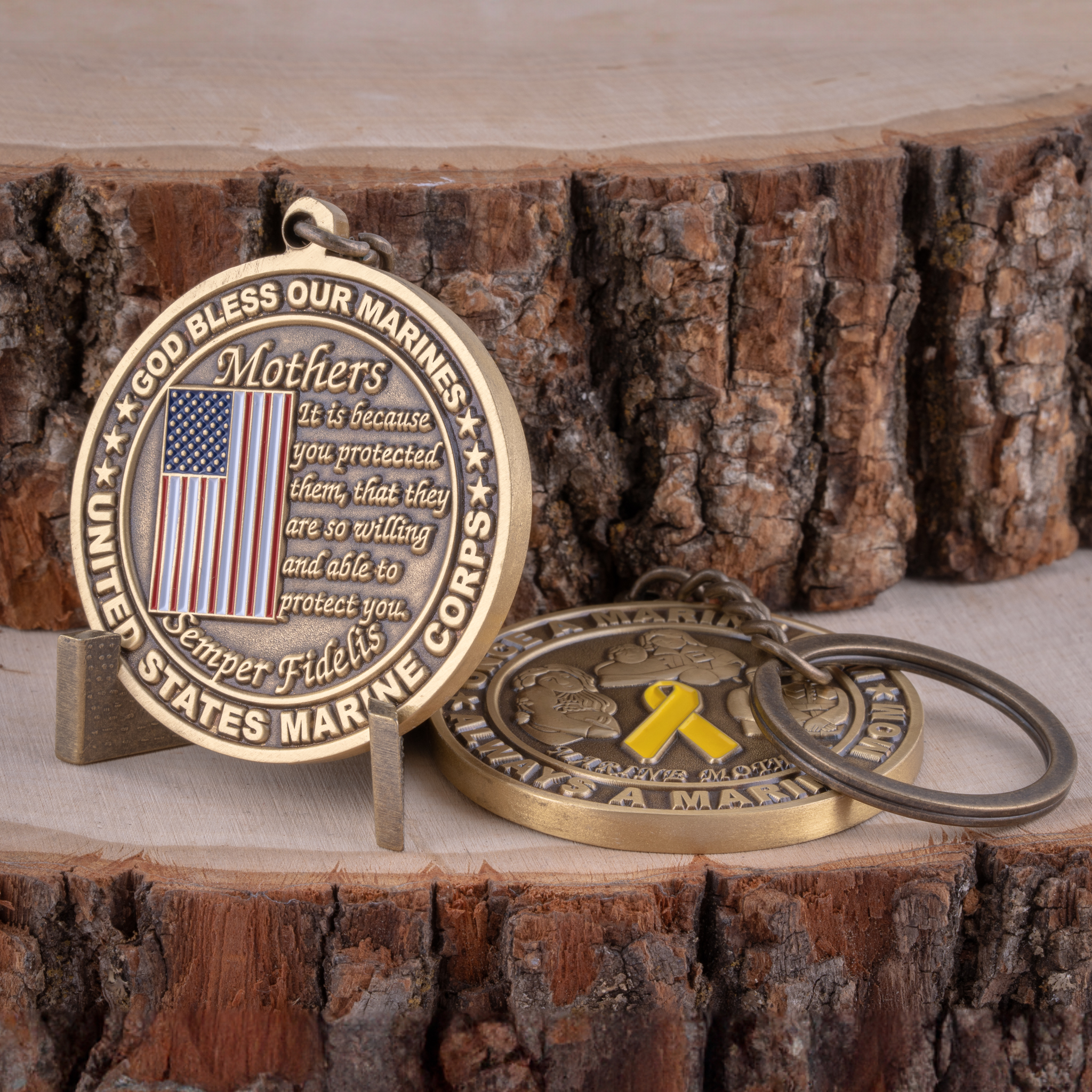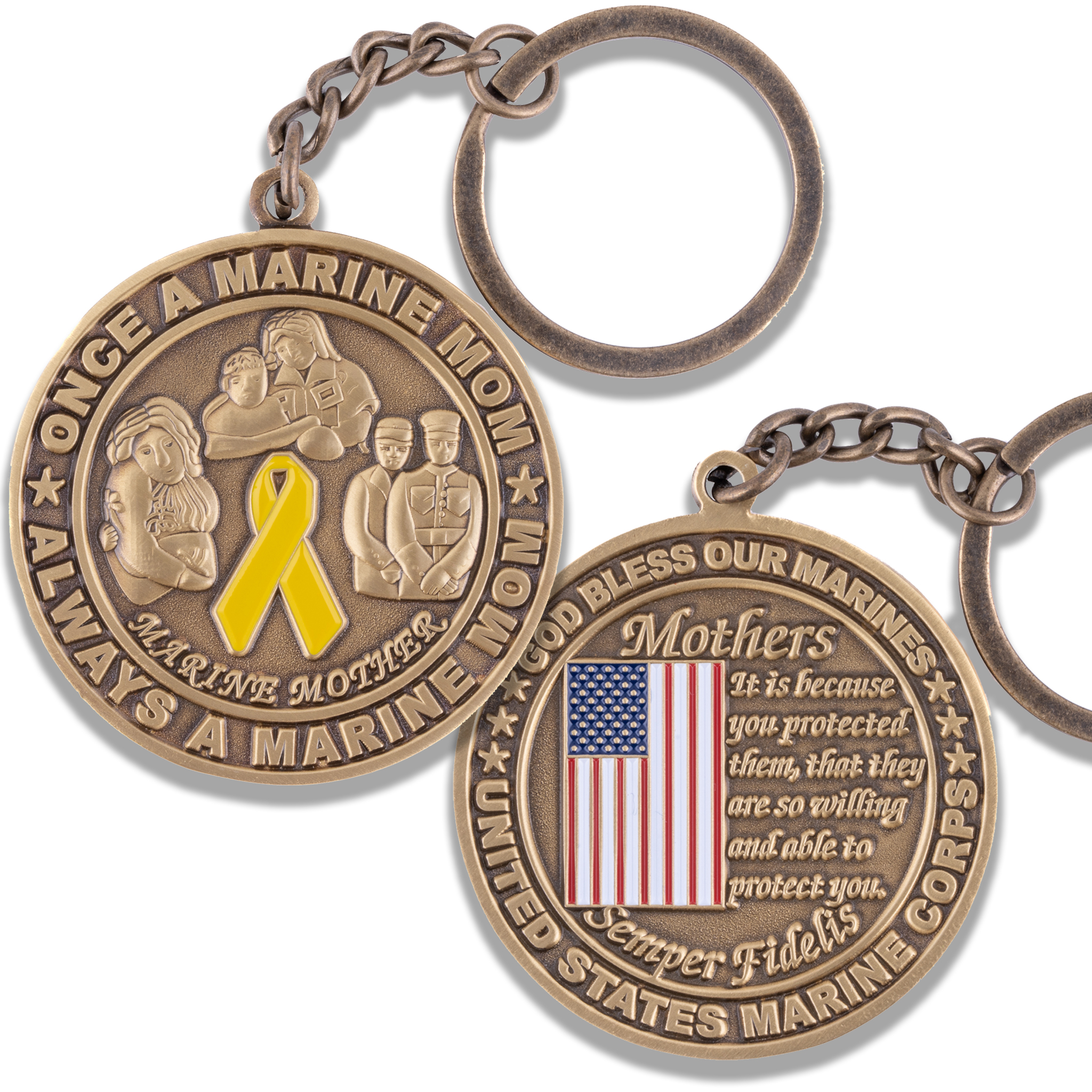 This 1.75″ antique brass keychain coin has a special message about being a proud Marine Mother, “It is because you protected them, that they are so willing and able to protect you” and is surrounded by the words “God Bless Our Marines” and “United States Marine Corps” in raised brass. The reverse side features the phrase “Once a Marine Mom, Always a Marine Mom” and showcases a yellow ribbon and Marine Mom imagery. This coin has a durable attached keychain that makes it portable as well as useful every day.