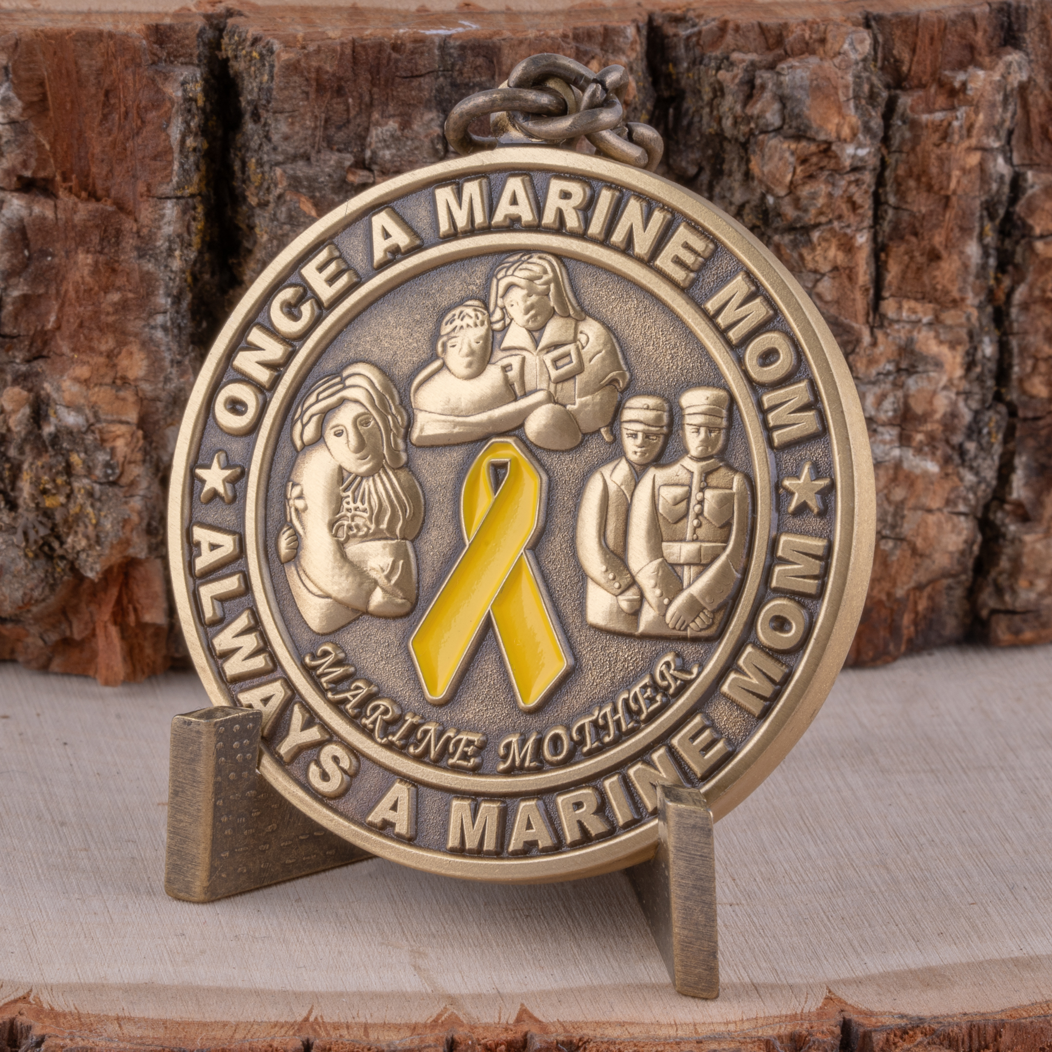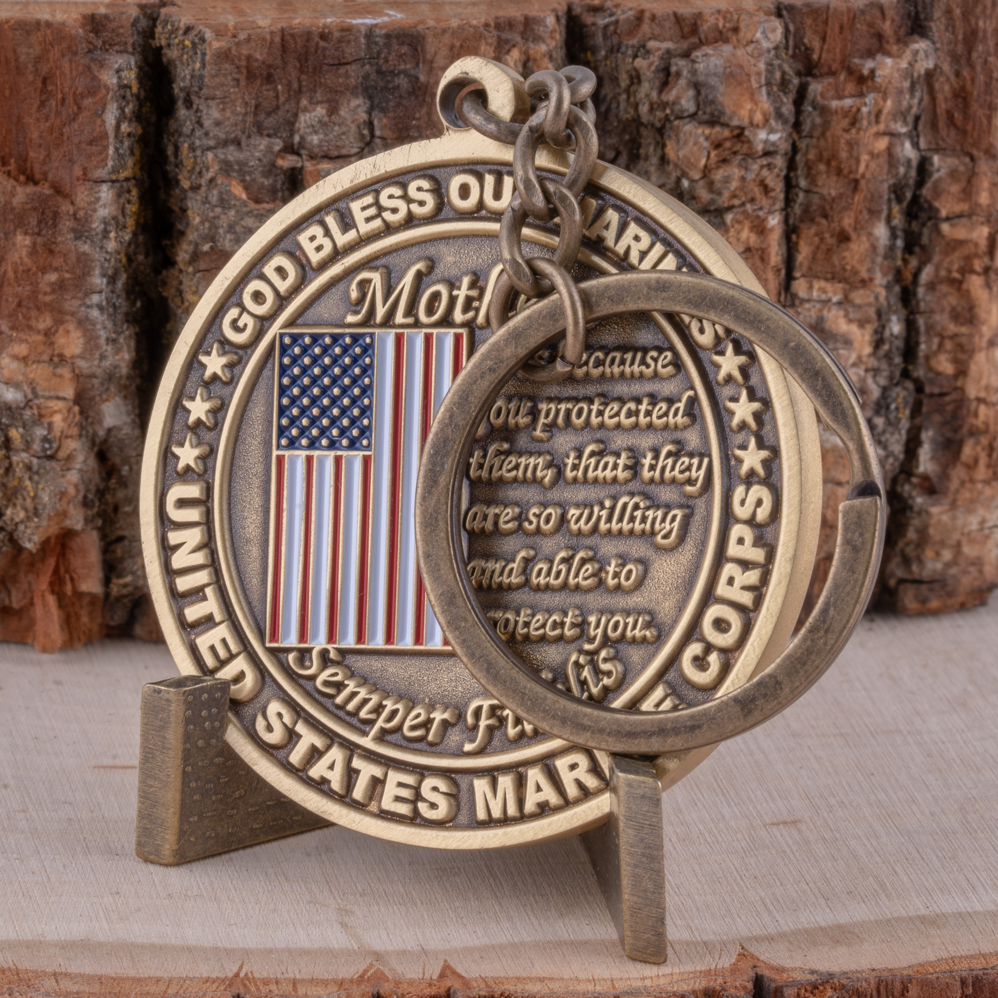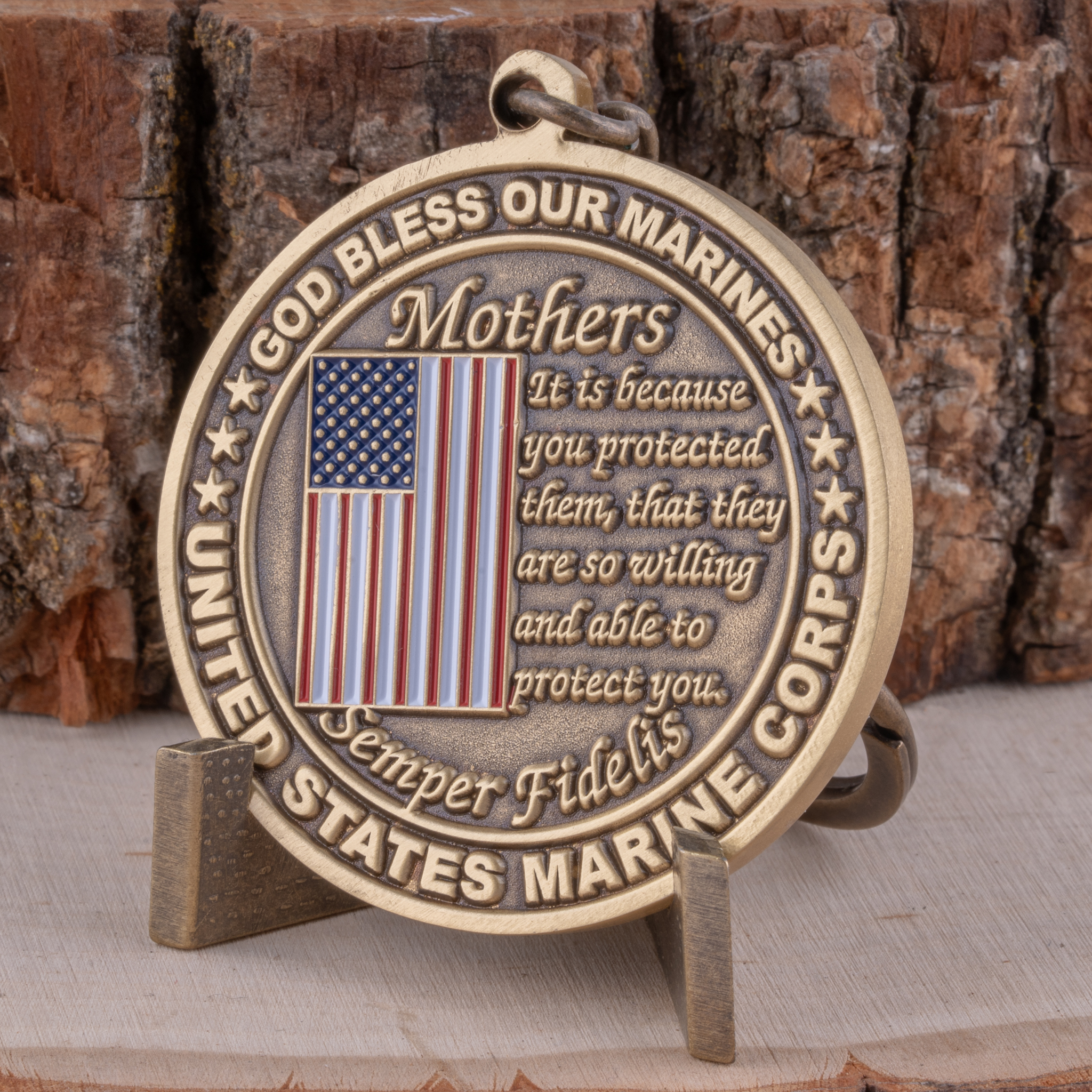 This 1.75″ antique brass keychain coin has a special message about being a proud Marine Mother, “It is because you protected them, that they are so willing and able to protect you” and is surrounded by the words “God Bless Our Marines” and “United States Marine Corps” in raised brass. The reverse side features the phrase “Once a Marine Mom, Always a Marine Mom” and showcases a yellow ribbon and Marine Mom imagery. This coin has a durable attached keychain that makes it portable as well as useful every day.