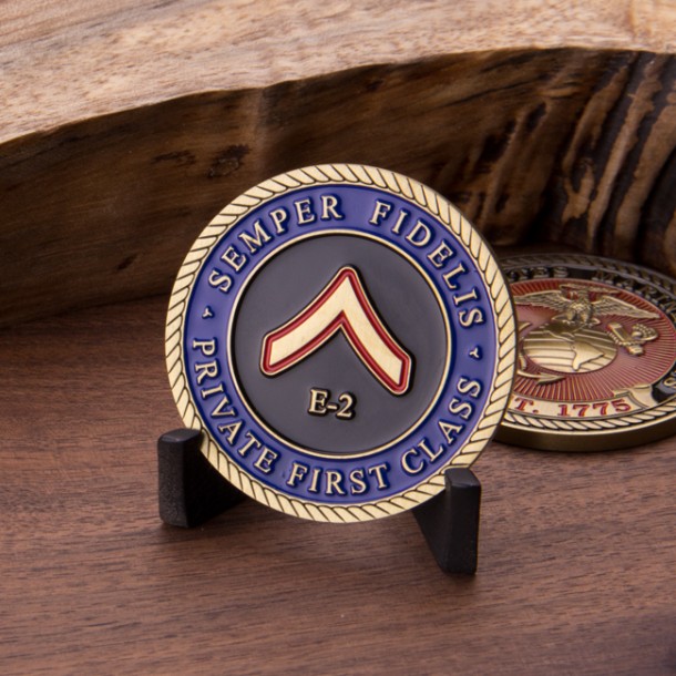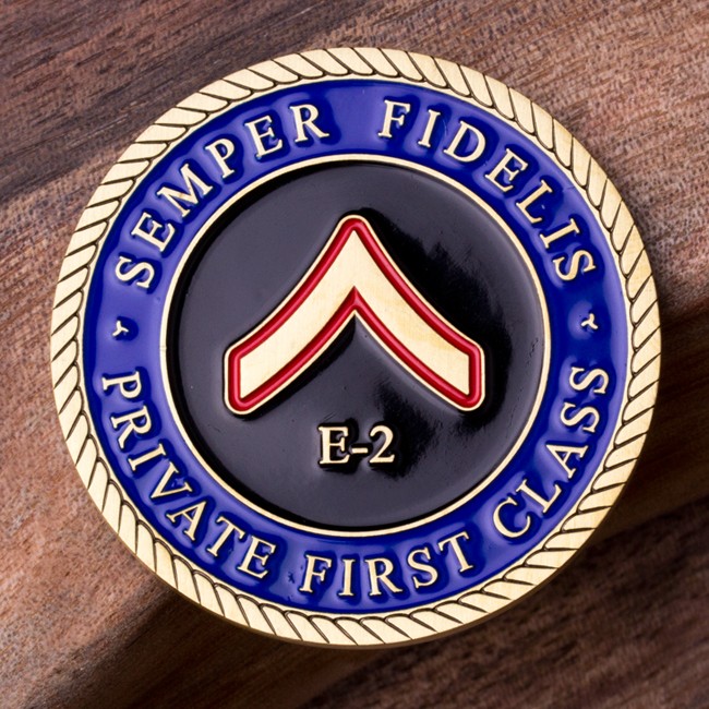 This challenge coin is 1.75″ antique brass with a real rope edge. The front of the coin has a blue ring with the words “Semper Fidelis” at the top and “Private First Class” at the bottom. The middle of the coin has a black background and features the rank insignia in full color. The back of the coin has a 3D Eagle, Globe, and Anchor in antique brass on a scarlet background and “United States Marine Corps” surrounding the center.
