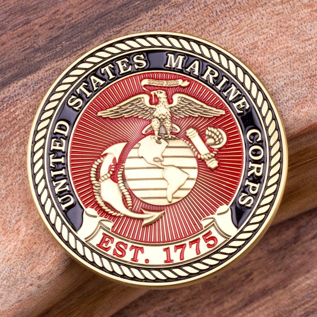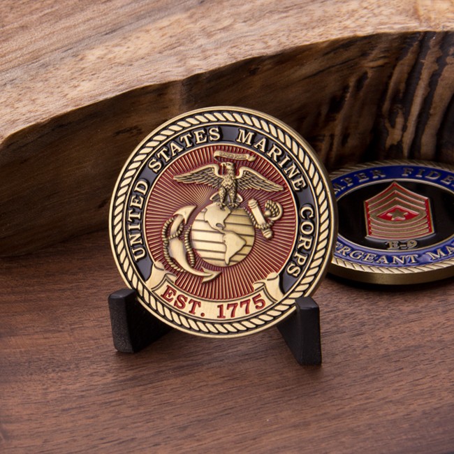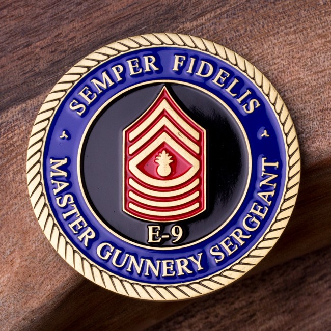 This challenge coin is 1.75″ antique brass with a real rope edge. The front of the coin has a blue ring with the words “Semper Fidelis” at the top and “Sergeant Major” at the bottom. The middle of the coin has a black background and features the rank insignia in full color. The back of the coin has a 3D Eagle, Globe, and Anchor in antique brass on a scarlet background and “United States Marine Corps” surrounding the center.