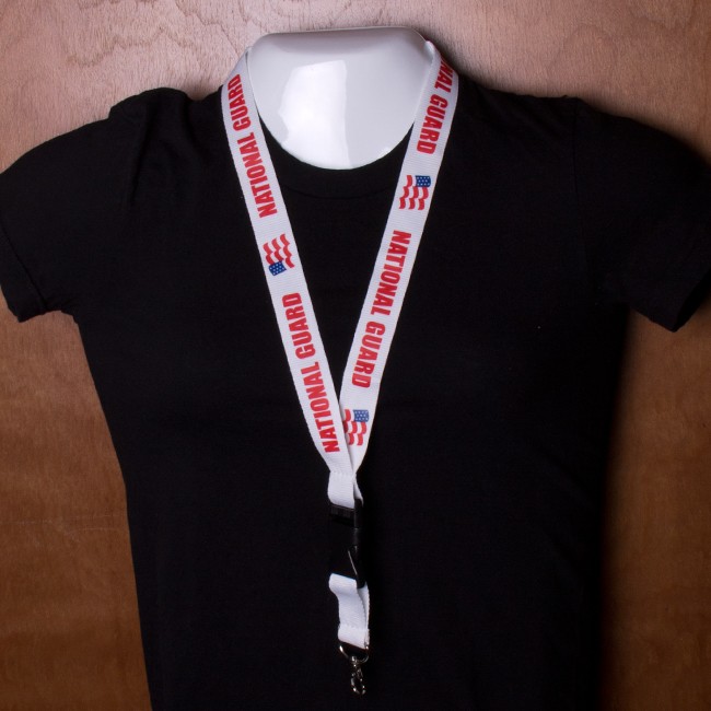 This red, white and blue imprinted polyester National Guard lanyard is 1″ in width and approximately 20″ long. It features repeating American flags as well as “National Guard” in bright red. Each lanyard comes complete with a sturdy quick release buckle and metal lobster claw to safely secure your belongings.