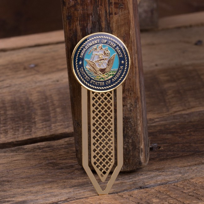 This 1” wide x 2.75″ long shiny gold bookmark features the Department of the Navy Emblem in full color. The perfect Navy accessory to mark any page!