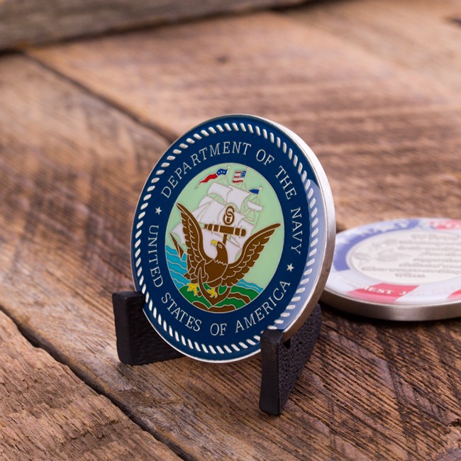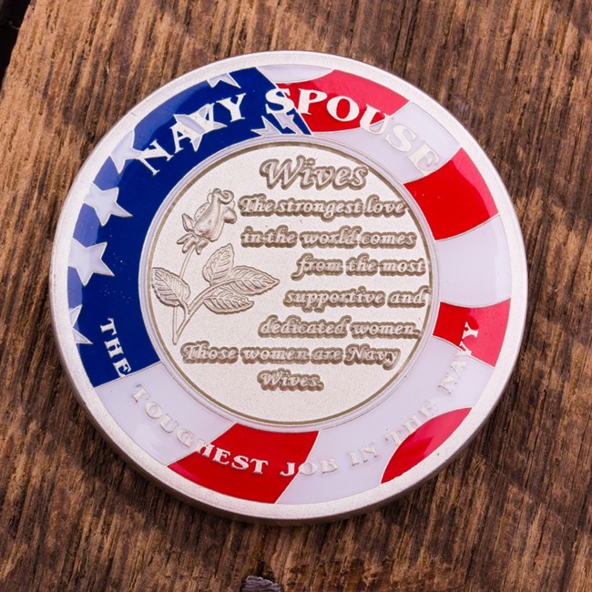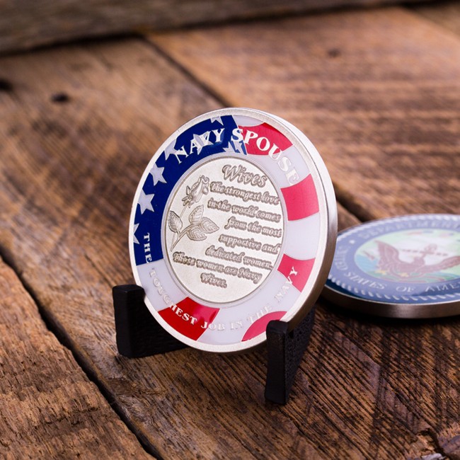 This beautiful 1 5/8″ antique silver challenge coin reads: “Wives, The strongest love in the world comes from the most supportive and dedicated women. Those women are Navy Wives.” The reverse side features the Department of the Navy Emblem in full color, and the coin has a protective clear epoxy coating on both sides. The perfect gift for any Wife of a Sailor!