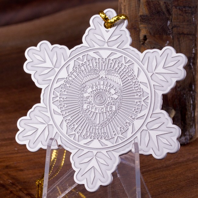 Let it snow, let it snow, let it snow! Celebrate the holidays and show your support for police officers with this 2.5” x 2.19” ornament, made in the shape of a snowflake. Both sides of this piece display a Police Officer logo in photo etched stainless iron, and the ornament comes with a small, gold glitter string for easy hanging. Makes a great gift for the holidays!
