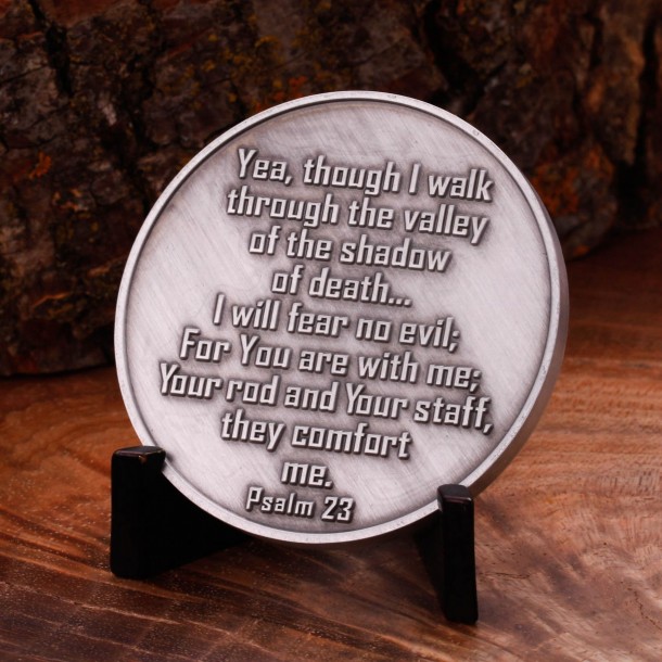 This 1.75” Psalm 23 Fear No Evil coin is beautify struck in antique silver with a deep-relief design to achieve a nice 3D effect. Hold onto this Psalm 23 coin for yourself or give this coin to a fellow military member to provide a mighty reassurance of faith while in harm’s way.