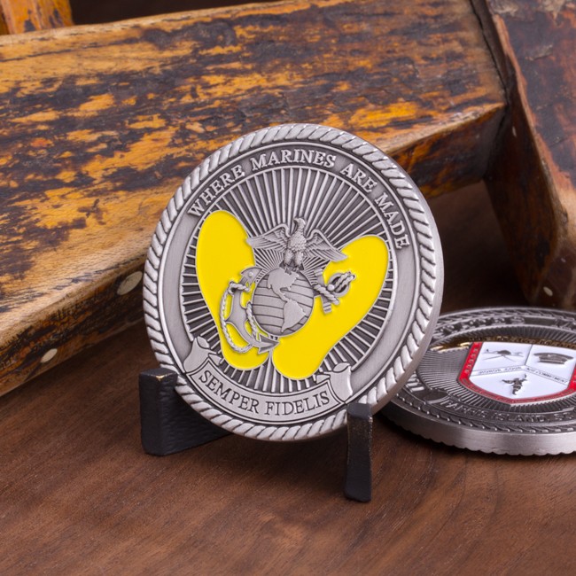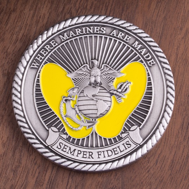 This 1.75″ antique silver challenge coin contains the raised words, “United States Marine Corps” and “Parris Island, SC” circling the logo of the Marine Corps Recruit Depot Parris Island. Shiny gold has been added to the ribbon with the text, “We Make Marines.” The reverse side displays the well-known yellow footprints underneath a 3D Eagle, Globe, and Anchor, and flanked by the raised text, “Where Marines Are Made” and “Semper Fidelis.” Both sides are encircled with a real rope edge.