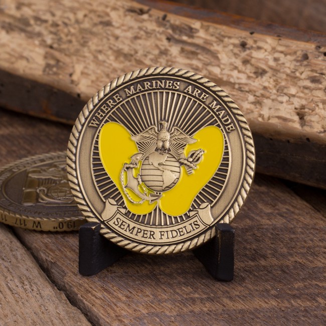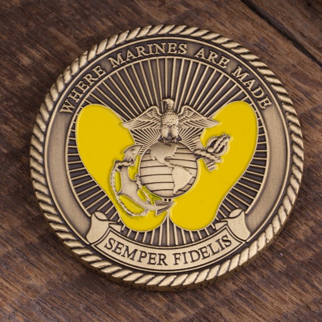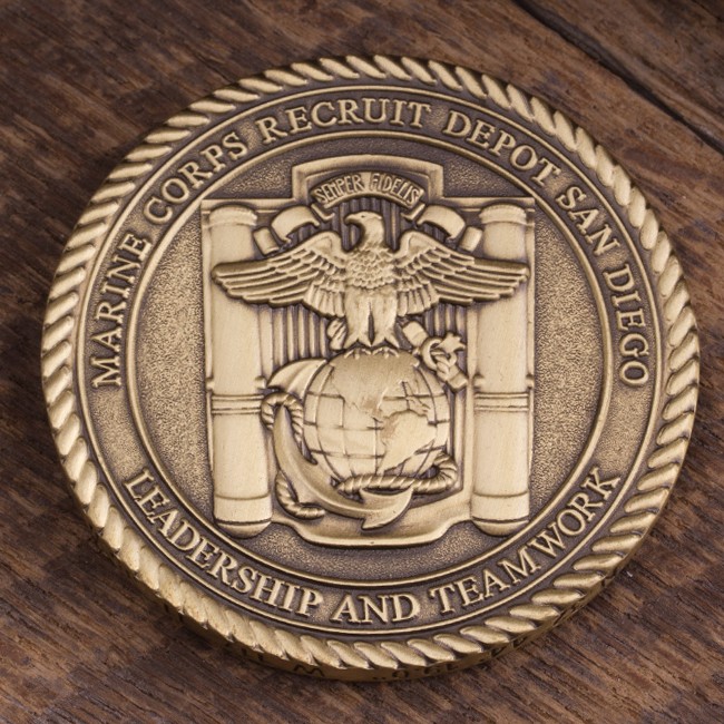 This 1.75″ antique brass challenge coin contains the raised words, “Marine Corps Recruit Depot San Diego” and “Leadership and Teamwork” circling the detailed 3D logo of the Recruit Depot in CA. The reverse side displays the well-known yellow footprints underneath a 3D Eagle, Globe, and Anchor, and flanked by the raised text, “Where Marines Are Made” and “Semper Fidelis.” Both sides are encircled with a real rope edge.