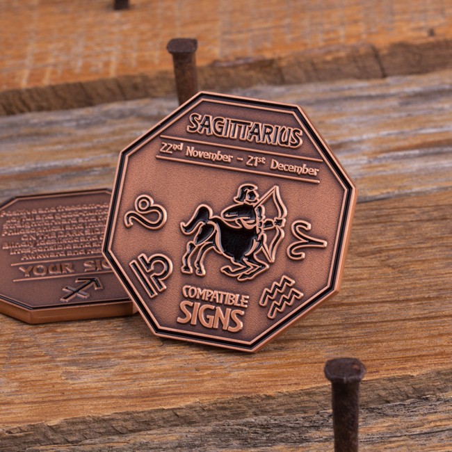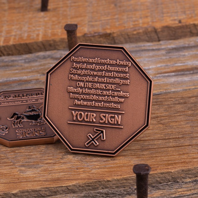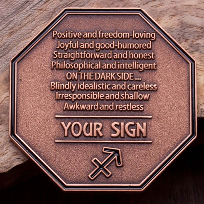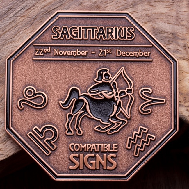 Do you ever question if you will be compatible with a new partner, or why you don’t get along with certain people? The answer may have to do with your astrological sign. Introducing a unique series of collectible coins that feature amazing facets of the Zodiac. These 2″ antique copper Sagittarius coins are octagon in shape and raised areas of metal allow for key design elements to be paint filled with black. The front sides feature the zodiac iconography along with compatible signs. The backsides of these Sagittarius zodiac gifts display the sign’s strengths and weaknesses, as well as the sign’s own symbol. Order your own sign, and your significant other’s sign.