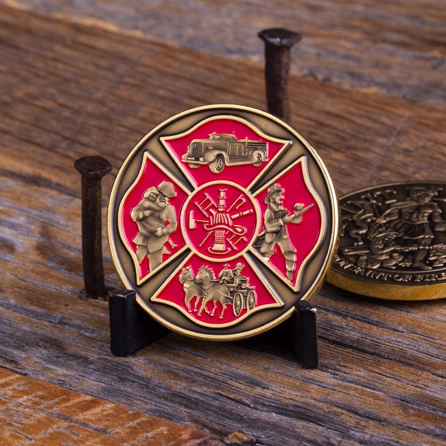 This striking 1.75” antique brass Saint Florian challenge coin honors all firefighters. The front side features 3D imagery of a fireman extinguishing a fire with the help of St. Florian, the patron saint of firefighters. The design is encircled by the words “SAINT FLORIAN” and “PATRON SAINT OF FIREFIGHTERS.” The reverse side of this Saint Florian coin has the fireman’s prayer and imagery of a ladder and fire hydrant, which are showcased within an outline of the fire and rescue emblem. A perfect gift for any firefighter!