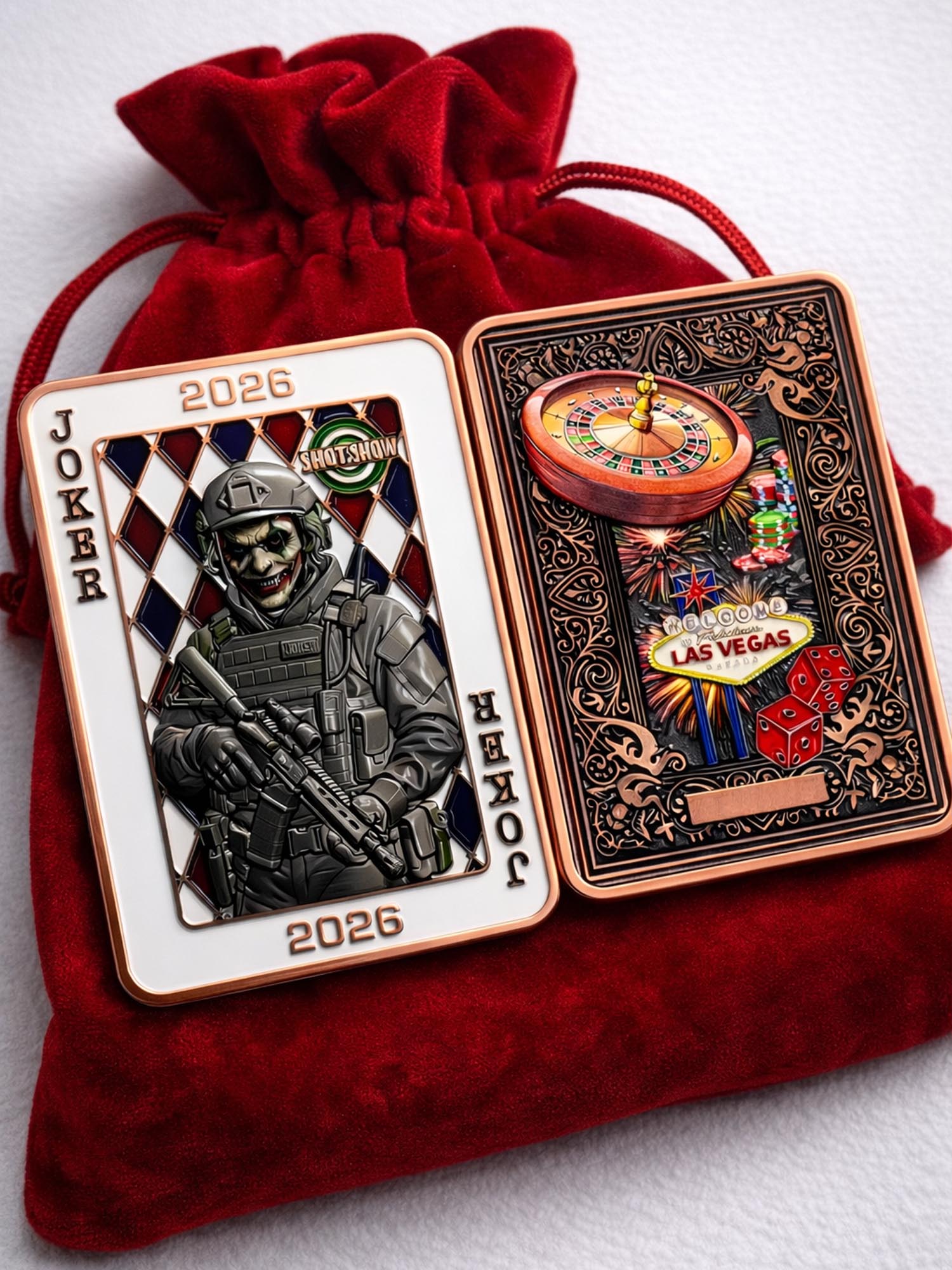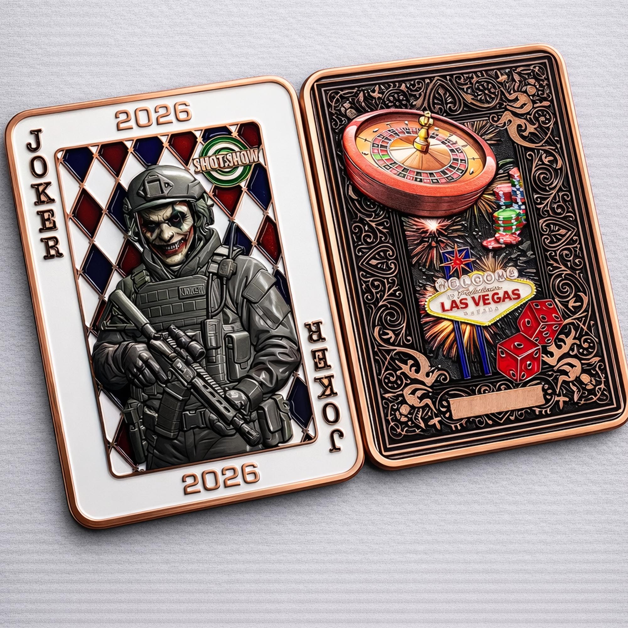 This Limited Edition Las Vegas Joker Challenge Coin, with its antique copper finish and 3.5-inch size, serves as a distinguished memento of this year’s SHOT SHOW. Through the latest UV printing technology, each detail is sharply brought into focus, creating a unique design to help define this moment in history.