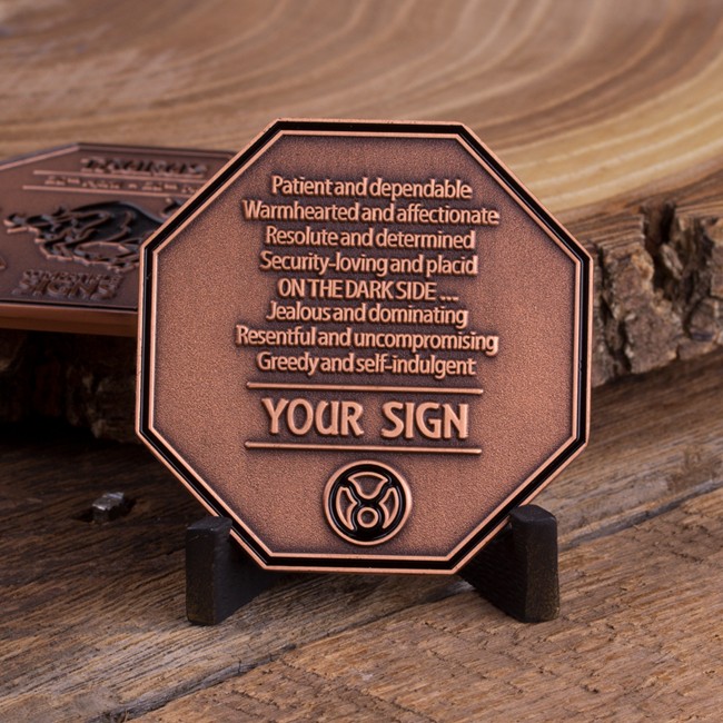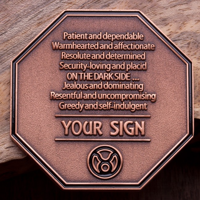 Do you ever question if you will be compatible with a new partner, or why you don’t get along with certain people? The answer may have to do with your astrological sign. Introducing a unique series of collectible coins that feature amazing facets of the Zodiac. These 2″ antique copper Taurus coins are octagon in shape and raised areas of metal allow for key design elements to be paint filled with black. The front sides feature the zodiac iconography along with compatible signs. The backsides of these Taurus zodiac themed gifts display the sign’s strengths and weaknesses, as well as the sign’s own symbol. Order your own sign, and your significant other’s sign.