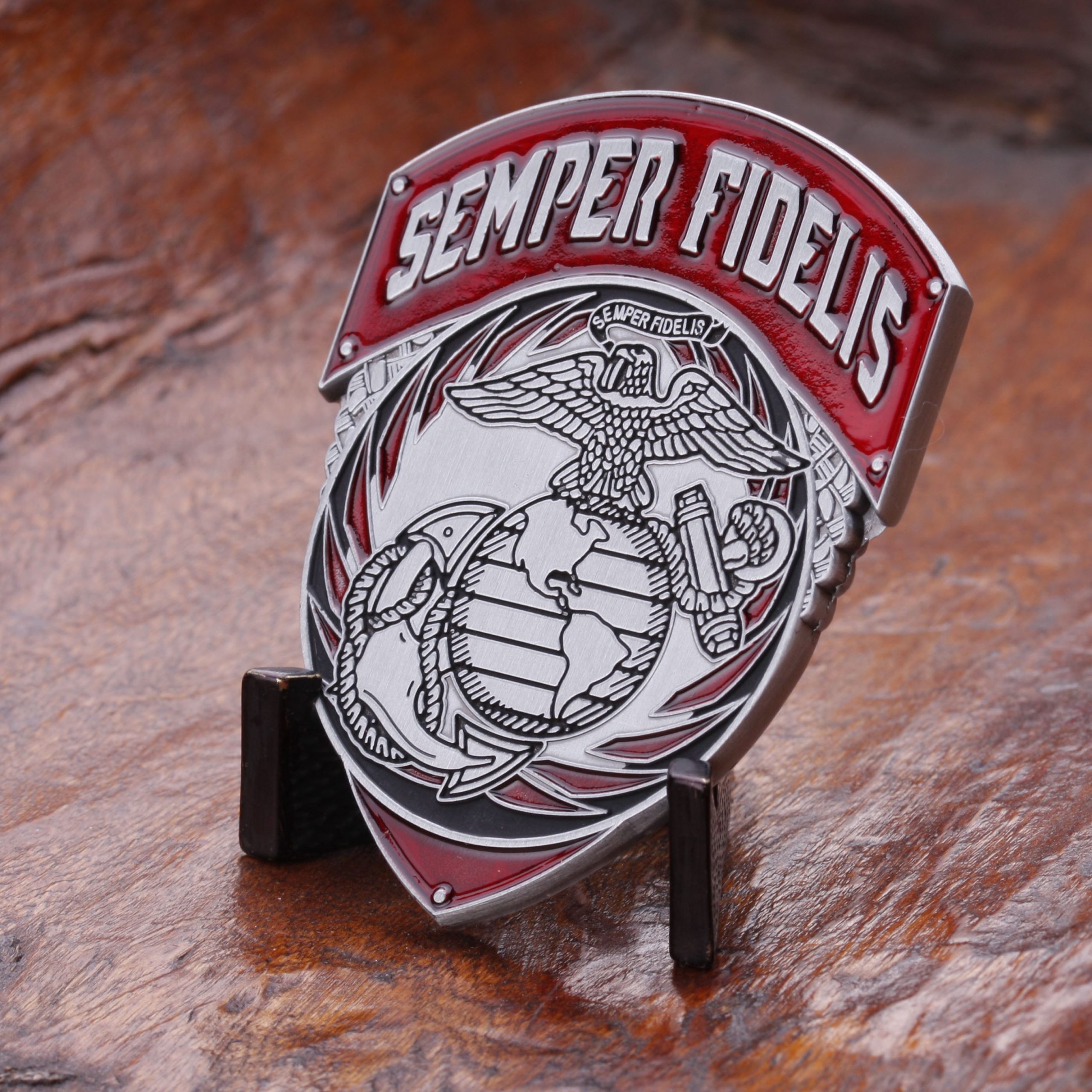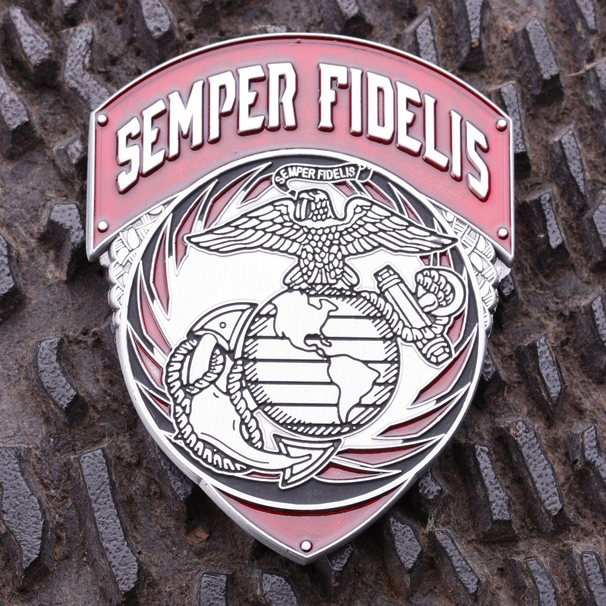 This Marine devil dogs coin is over the top with an odd shape cutout design, translucent red enamel paint fill, and matte black paint fill. This devilish looking blood thirsty dog and “Eagle Globe and Anchor” logo are place on a intimidating shield shaped coin that is 2.25 inches tall and 1.75 inches wide. This is a nice coin that any Marine would love!