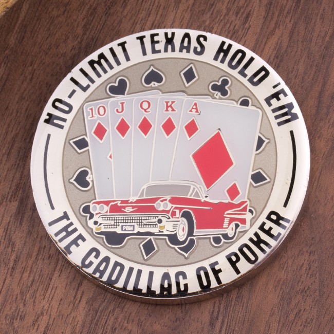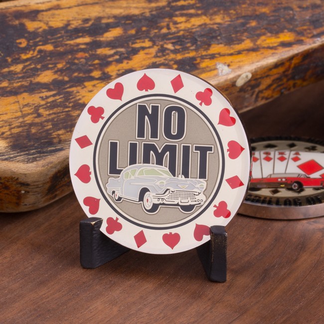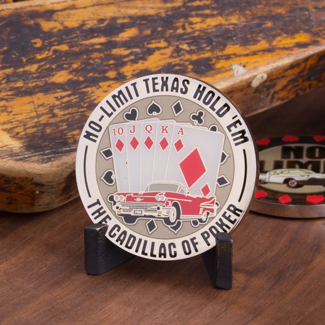This 1.75″ shiny nickel coin features a white antique Cadillac in front of the words “NO LIMIT” painted black, surrounded by a red border of playing card suits. The reverse side features a red antique Cadillac in front of a royal flush with a border that reads “NO LIMIT TEXAS HOLD ‘EM” and “THE CADILLAC OF POKER,” also in bold black text. Both sides are covered with a protective clear epoxy coating. A great addition to any coin collection, and can also be used as a card guard!