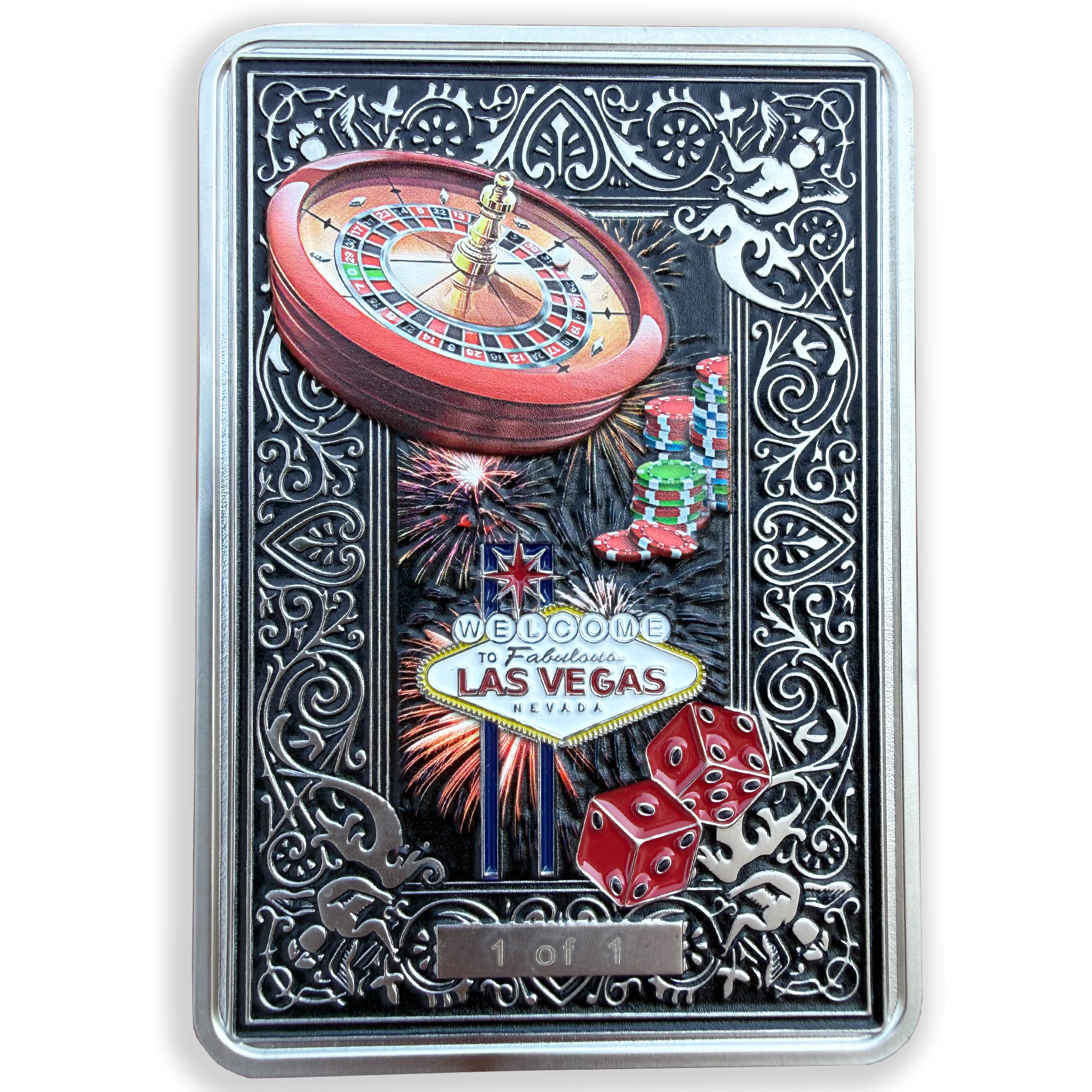 The front of the coin features the a crazy looking Joker with a tactical rifle. On the flip side, the iconic Las Vegas Sign and a traditional roulette table with dice. The bottom of this side is marked with a pair of red dice to symbolize the luck of Vegas.