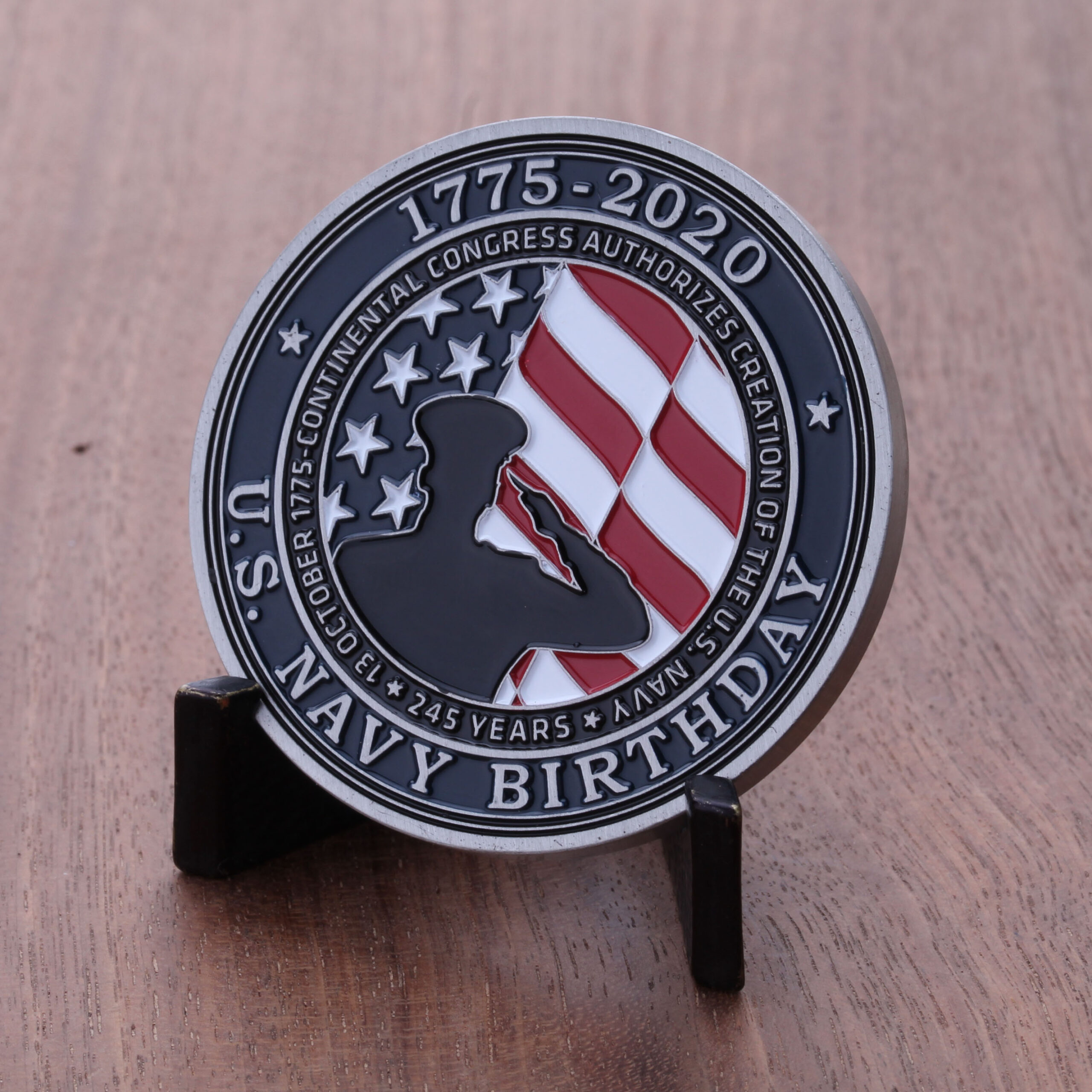 This 2020 U.S. Navy Birthday Ball Challenge Coin features images of sailors in action with a modern Aircraft Carrier, f/A-18 Hornet aircraft, and a seaman hard at work with the text “In Honor Of All Who Served”. The other side of the coin includes the words, “245 Years, 13 October 1775 Continental Congress Authorizes Creation of the U.S. Navy”. The text “U.S. Navy Birthday” is proudly displayed with 1775-2020 along the top.