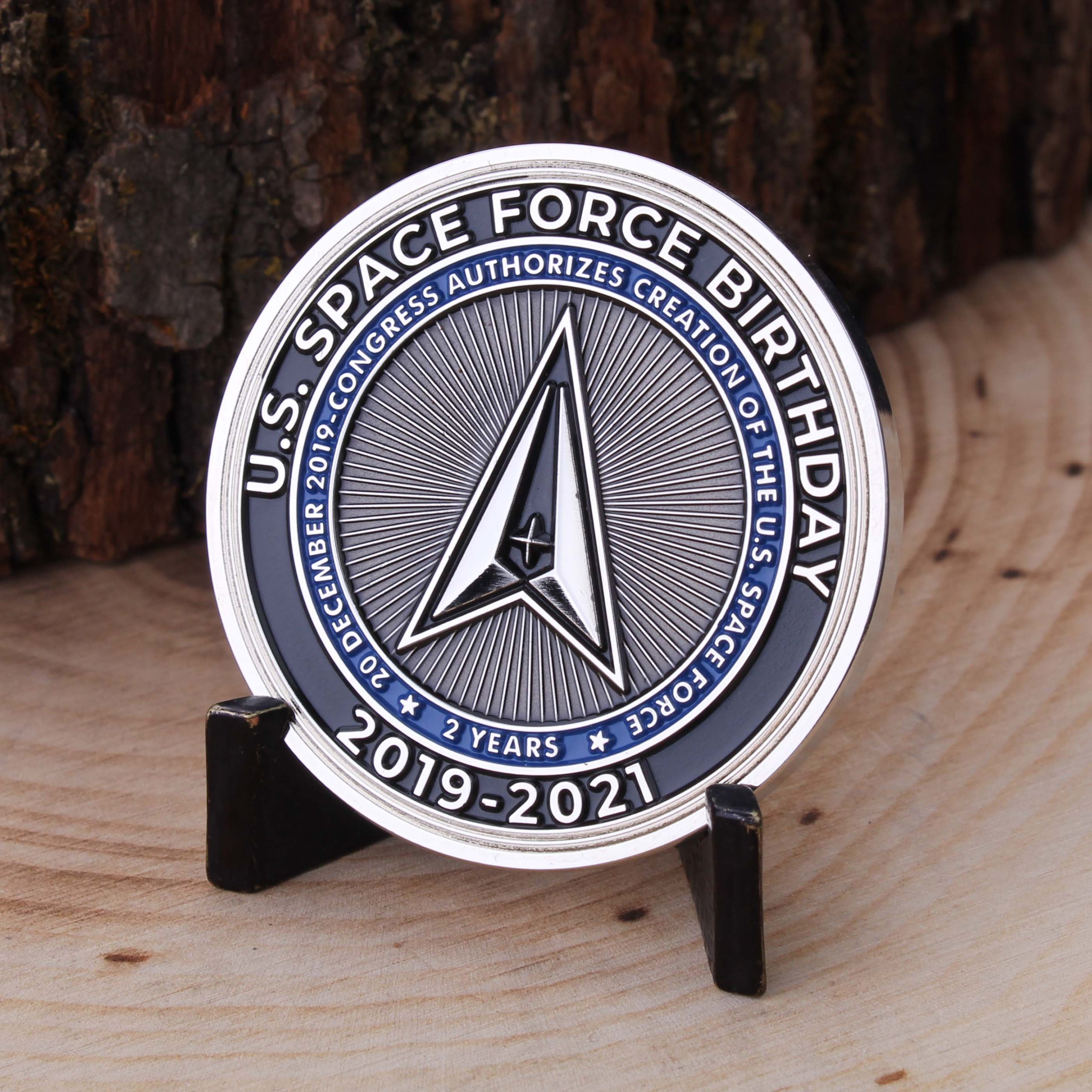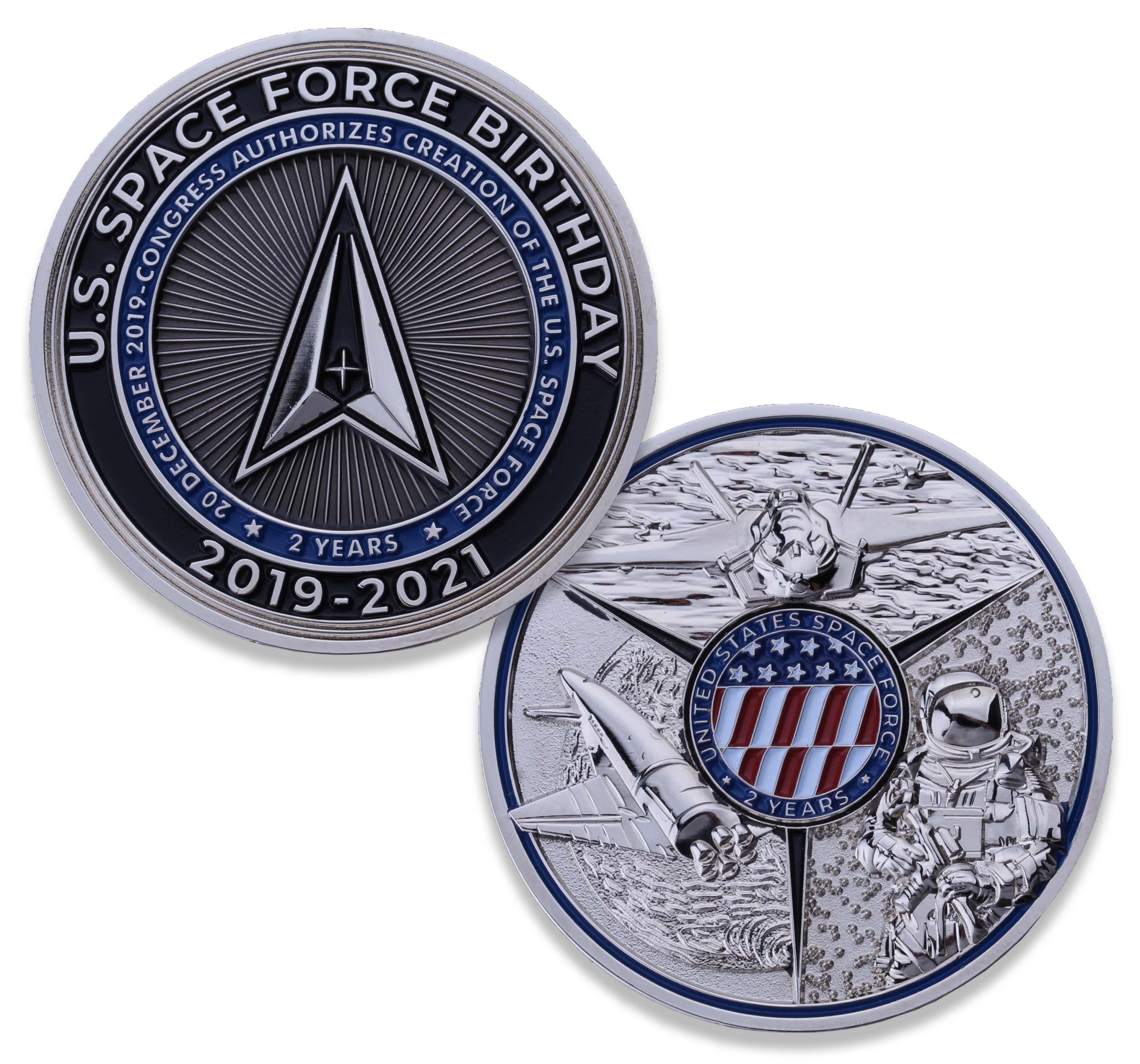 The other side of the coin includes the words, “U.S. Space Force Birthday” at the top. The text “2019-2021” is written along the bottom.