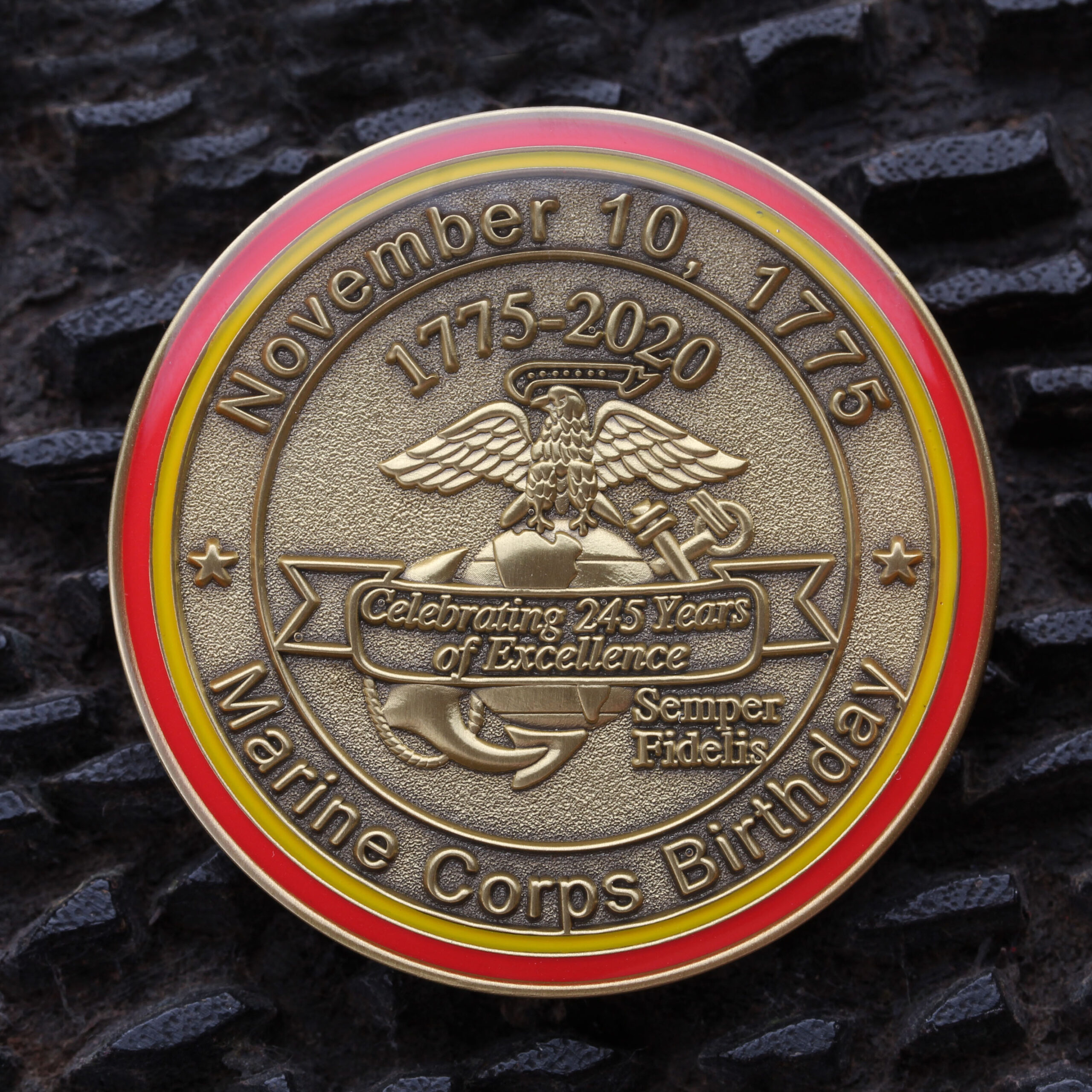 This 1.75″ antique brass 2020 Marine Birthday challenge coin features a black and white picture insert of the Iwo Jima flag raising in recognition of the 75th anniversary of the battle. The front of the coin includes the words “United States Marine Corps,” “75th Anniversary,” and “The Battle of Iwo Jima.” The back of the coin declares, “Celebrating 245 Years of Excellence” over the Eagle, Globe and Anchor. The Marine Corps Birthday of November 10, 1775 is proudly displayed along the top. Scarlet and gold rings add a finishing touch, and the coin has a protective clear epoxy coating on both sides. Semper Fi!