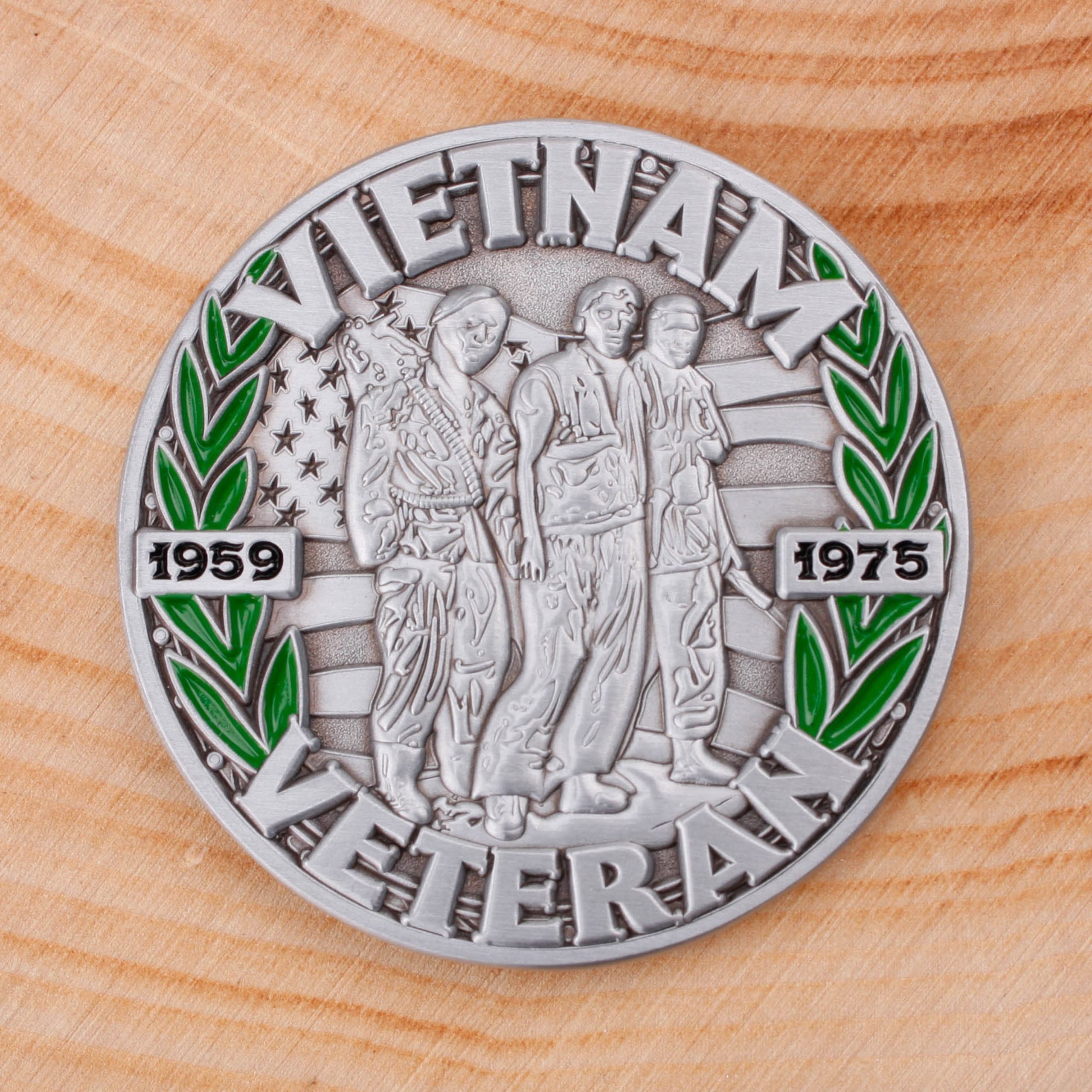 This 1.75” antique silver POW Challenge Coin has great 3D relief featuring the Vietnam Veteran ribbon, country & POW/MIA on one side and 1959 – 1975 on the other with “Vietnam Veteran”. Add this Vietnam Veteran coin to any personal collections or give it away as a gift.