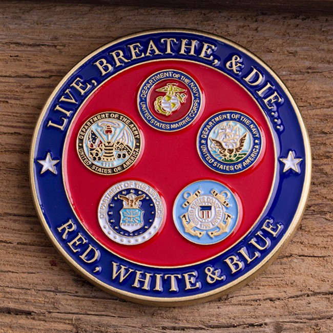 This 1.75″ antique brass coin features a yellow “Support Our Troops” ribbon resting on a colorful American flag background, encircled by the words, “THANK YOU FOR YOUR SERVICE” and “WELCOME HOME!” The reverse side depicts the emblems of the 5 major military branches on a red background, surrounded by the phrase “LIVE, BREATHE, & DIE… RED, WHITE & BLUE” encompassed in a dark blue outer ring. Welcome your favorite service member home with this beautiful challenge coin!
