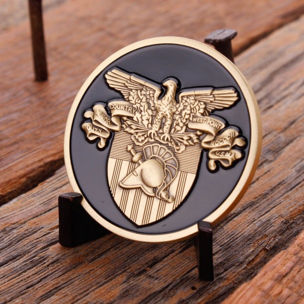This challenge coin is for the United State Military Academy (USMA), also known as West Point, which develops America’s finest U.S. Army Officers. It was originally established as a fort that sits on strategic high ground overlooking the Hudson River, 50 miles north of New York City. It is one of the four U.S. military service academies, established in 1801. Cadets are required to adhere to the Cadet Honor Code, which states that “a cadet will not lie, cheat, steal, or tolerate those who do.” The academy bases a cadet’s leadership experience as a development of all three pillars of performance: academics, physical, and military. The academy also fields fifteen men’s and nine women’s NCAA sports teams.