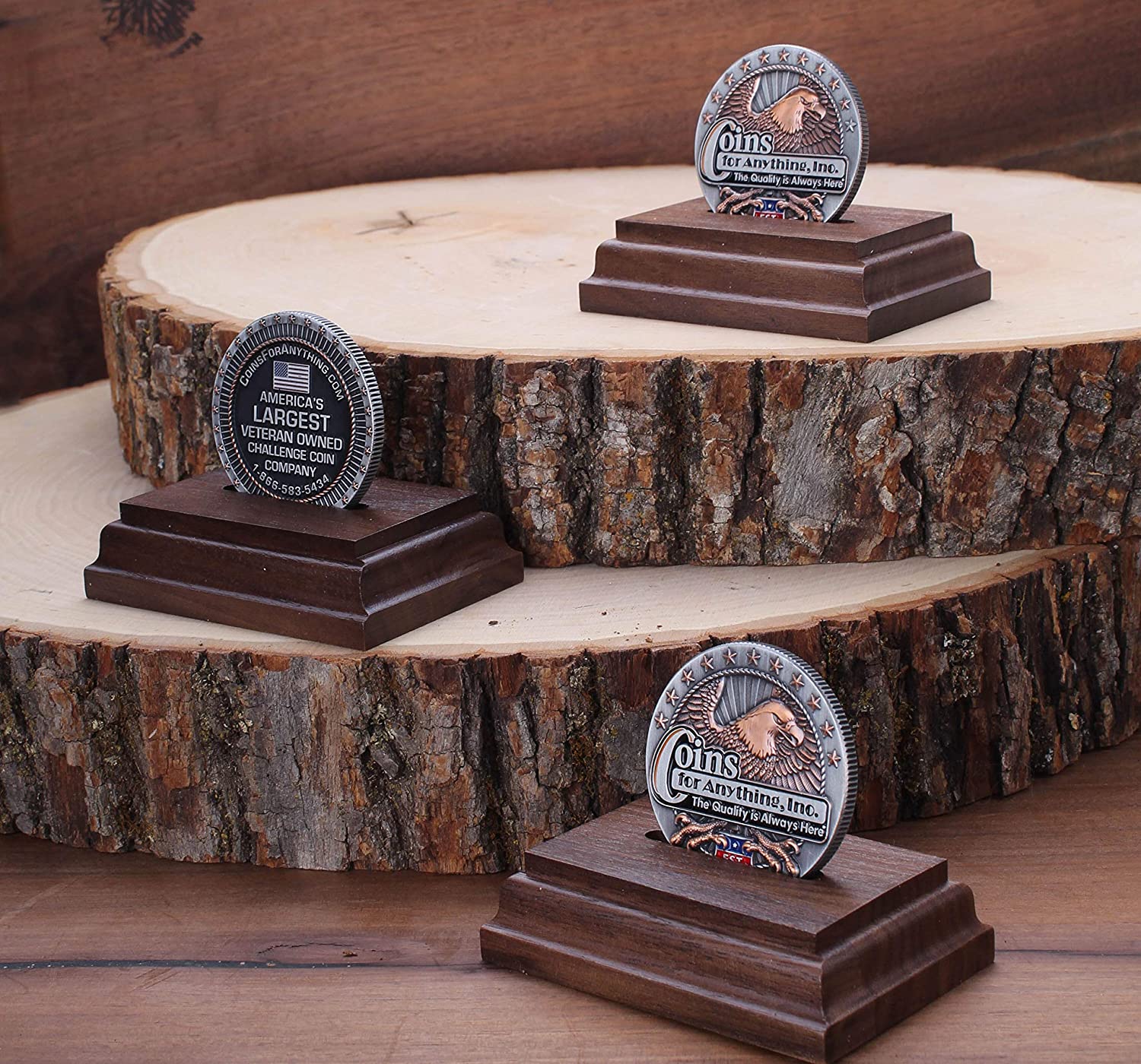 This durable wood military coin holder is 3″ wide x 0.75″ tall and will perfectly display your favorite coin up to approximately 3″ diameter. The rectangular base features a raised 3-tiered platform with a groove to hold round coins. A unique desk coin holder to showcase your collectible coin!